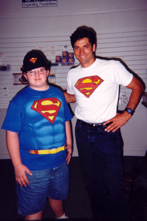 There was a short line as we entered (much different from each of the following years), and we saw some folks sitting at tables signing autographs. The first person we met was Gerard Christopher– Superboy from the “Adventures of Superboy” TV series. (That’s him above with Dave’s younger brother Ronnie). Next to him was comic artist Kerry Gammill (who we had met in Memphis at the 1992 Fantasy Con). We bought some signed photos and art from Gerard and Kerry. Then we moved down to the last table where artist Alex Ross was sitting!