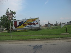 We took the Metropolis exit and headed towards town. It was looking a lot more like Smallville than Metropolis. A few hotels, a gas station, some fields, some more fields, a McDonalds, a car lot, a Sonic, and then a big welcome sign as we passed a park and made a right- “The Massac County Chamber of Commerce Welcomes You to Metropolis- ‘Home of Superman’”.