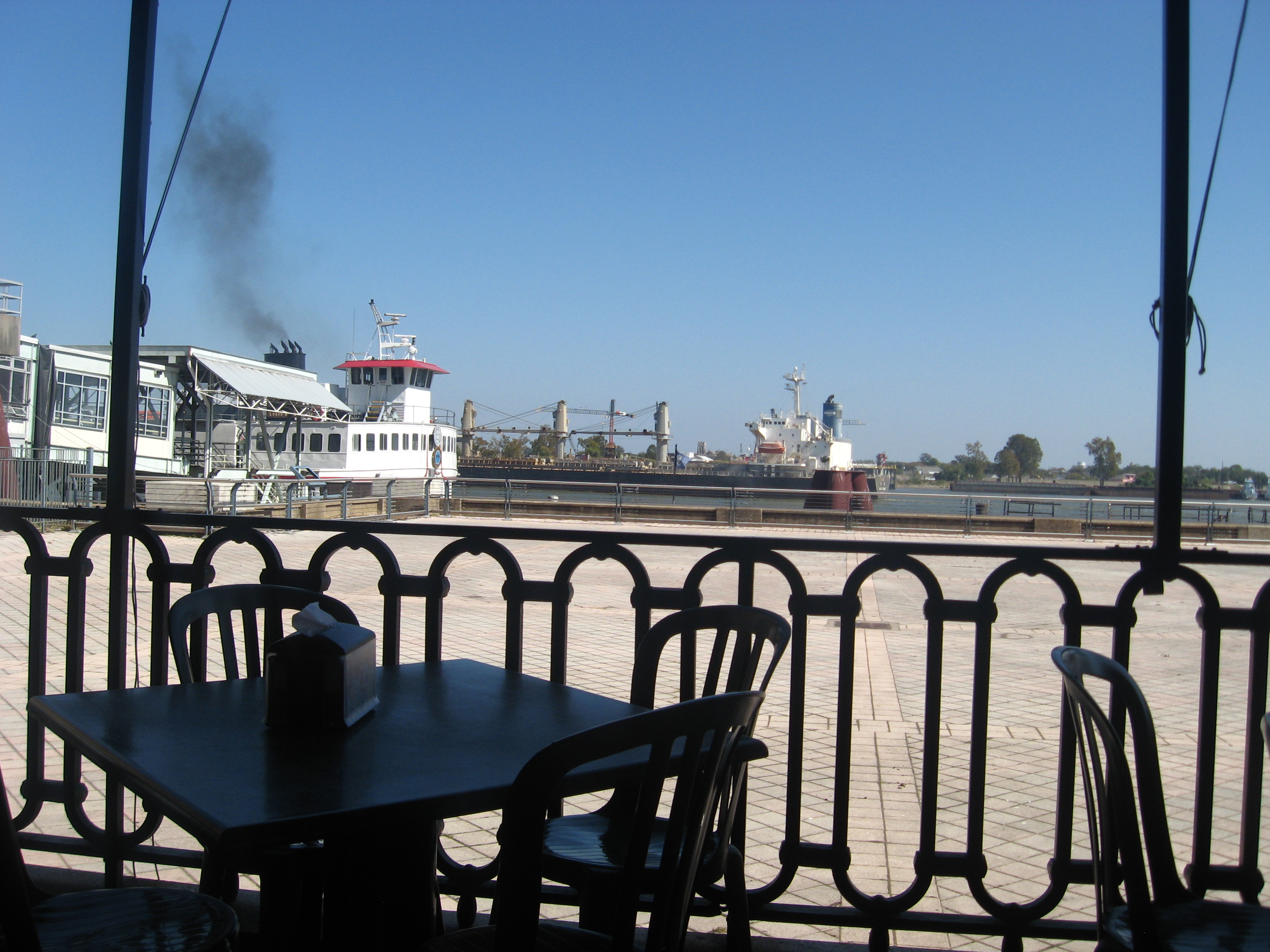 There were also a few barges and other boats traveling up and down the river, and several pigeons and some sea gulls flying around near the ferry landing. The weather was nice and there was also a guitar player outside on the patio area which went great with the river view. There was a pigeon who came over and enjoyed a few fries near our table who was fun to watch, too.