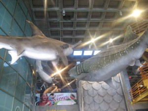 As we entered to the right was the gift shop- which looked very inviting, and above our heads were several ginormous sharks hanging from the ceiling! Ok, so far so good- things look promising for seeing some real sharks here!