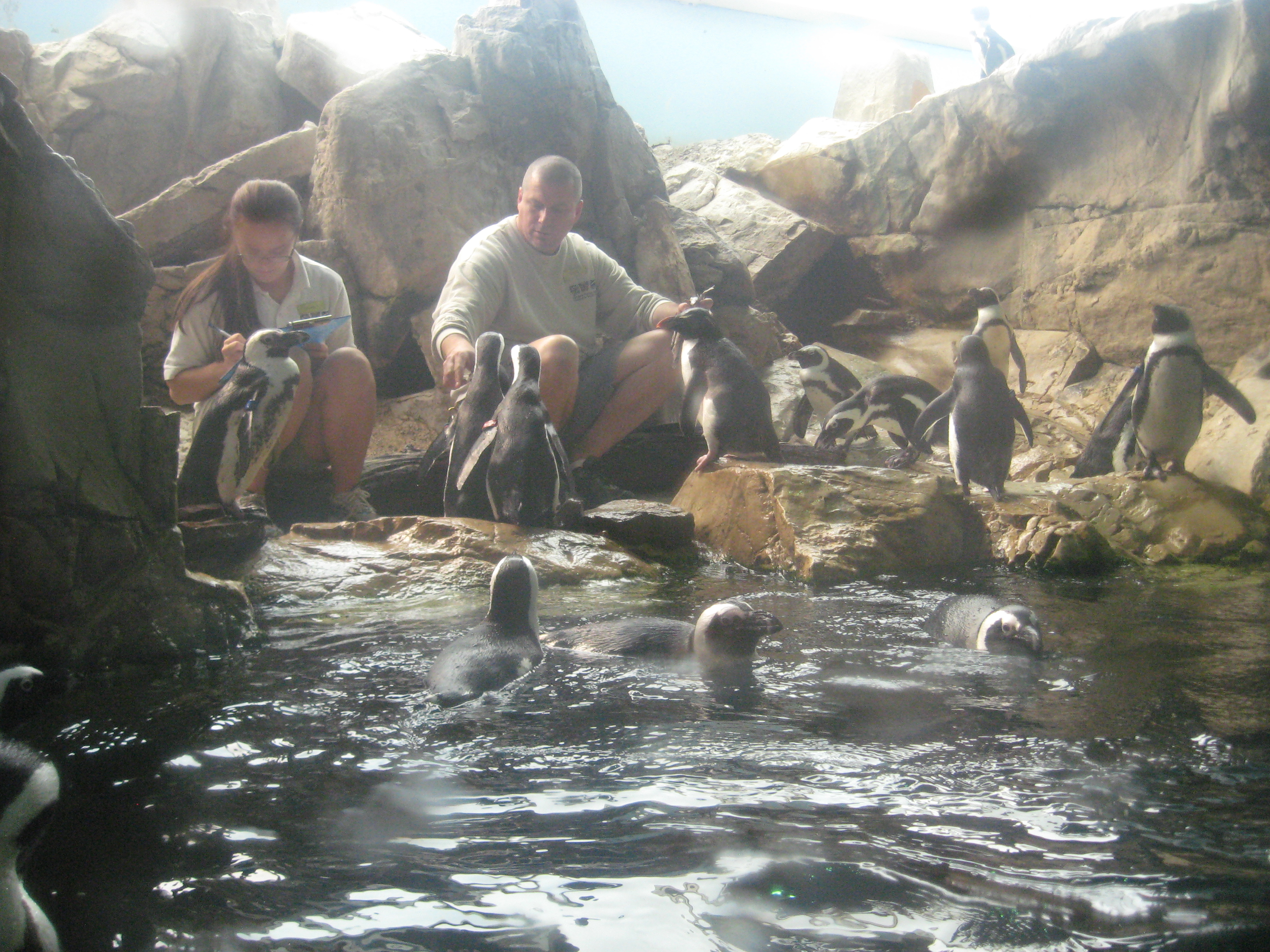 The next section had penguins and we got there for feeding time, and apparently in time what comes after- poop time! Yep, got to witness what happens when a penguin goes in the water. It was pretty funny to watch the other penguins try to avoid the floating smoke cloud of crap. Each of the penguins had a color coded “arm band” with their names on them. There was a zoo keeper there to answer questions from the crowd. Nobody had to ask where/how does a penguin go to the bathroom.