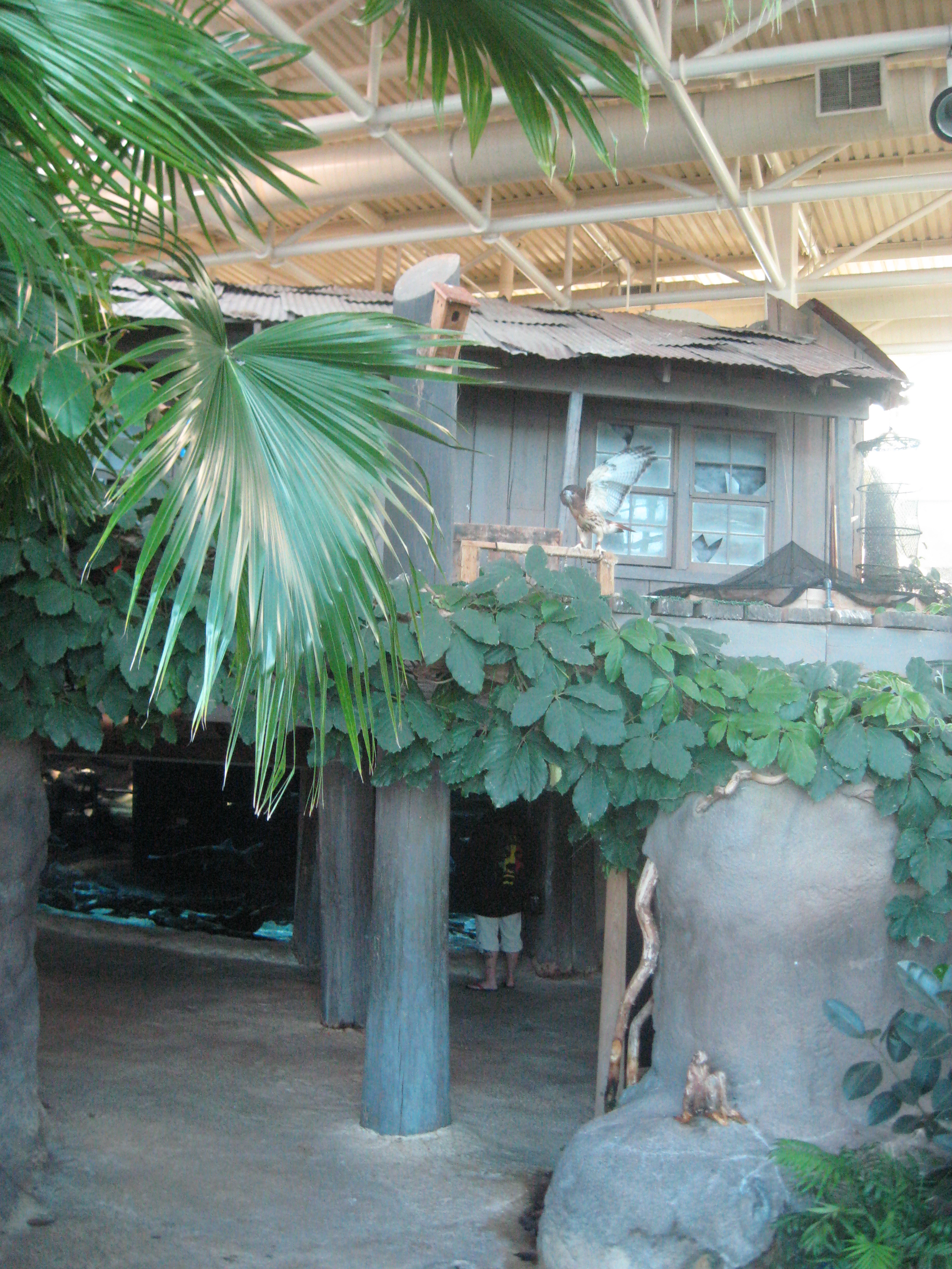 At the top of the escalator was a few large tanks with giant catfish! There was also a few other tanks around, piranhas, a waterfall, lots of trees, some birds, plus what looked to be a tree hut.