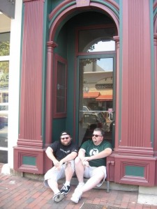 Once we arrived in Red Bank we drove down Broad Street past the Secret Stash on the right, and Jack’s Music Shoppe on the left. We made the next right to look for a parking space. I was really digging the architecture and downtown area! We soon found a spot to park down the block. I grabbed my camera and a Bushi Tales comics promo pack- we were giving them to all the comics retailers we met on the trip. As we were walking back towards Broad Street I recognized a building on the right. It was the one Holden McNeil/Ben Affleck stops in front of during the Chasing Amy rain scene! I love seeing places where movies were filmed- especially films I like! I’ve seen Chasing Amy dozens of times.