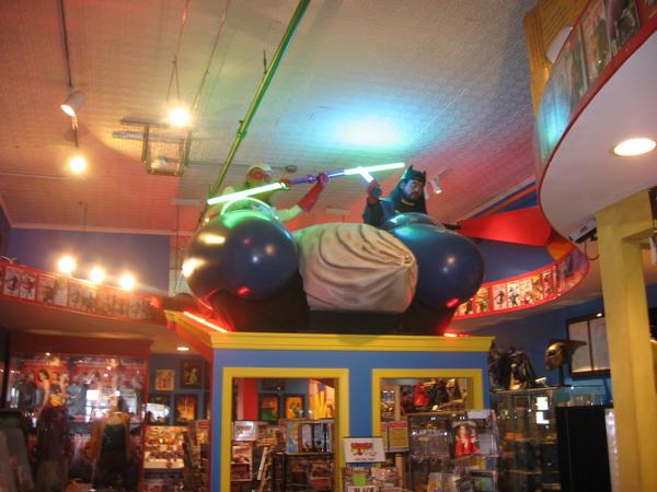 It wasn’t the only piece of Kevin Smith movie memorabilia in the shop- the place was full of it! There was even the “Blunt-mobile” near the ceiling! Art from Chasing Amy was on the walls including the last page of Holden’s Chasing Amy comic, Banky’s 4-way myth drawing, and some blueprints for taking down the stage in Mallrats! The right side of the store had some items stacked on top of some comic book longboxes. They mentioned that the Stash had been cleaned up a bit on the first episode of Comic Book Men. Yep, it had been for sure. That side was a bit junky- not hoarders junky, but stacked up pretty good.