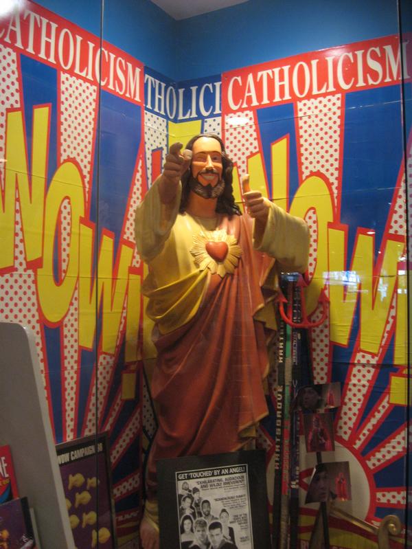 Buddy Christ from Dogma was towards the back of the store. “Catholicism WOW!” Matt Wagner Green Arrow comic covers from Kevin’s run on the series were hanging in the back of the store, too. Lots to see.