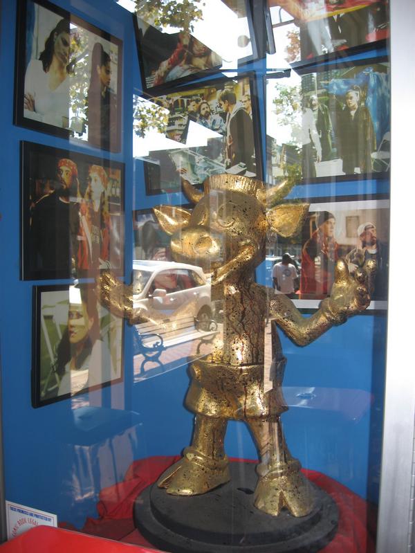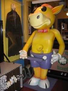 This golden calf Mooby was used in the movie Dogma during the board room massacre scene with Ben Affleck and Matt Damon.