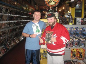 It was great to meet Walt Flanagan while we were there. Walt not only manages Jay and Silent Bob’s Secret Stash, but has appeared in several of Kevin’s movies and comics- usually as an irate fanboy. He not only acts, but also makes comics! He’s worked as artist on Batman: Cacophony and Batman: The Widening Gyre with Kevin. I bought a copy of Walt’s comic Karney (written by Bryan) and gave him copies of my comic Bushi Tales. He was nice enough to sign my comic and take a pic with a fellow fanboy. He’s also one of the stars of Comic Book Men.