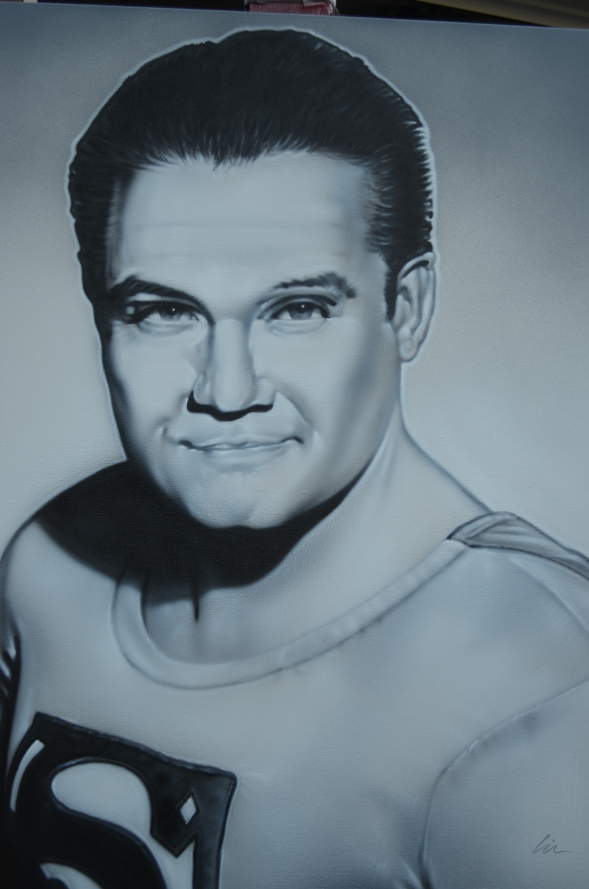 We spent the rest of the afternoon and evening unloading the van, hanging lights and movie screen in Planet Krypton, and setting up tables and art panels in AA&WW. The panels would be used for the art contest and art show. One of the pieces on display was my latest George Reeves paintings I finished just before heading to Metropolis. Thankfully airbrushed acrylics dry really fast!