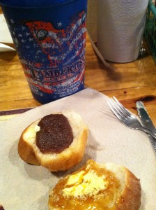 While waiting for our lunch to arrive I got a roll, smothered it in butter, put applebuter on one half- molasses on the other half, and washed it down with some sweet tea! After our food arrived, more food just kept coming- they bring “pass-arounds” like fried okra, fried potatoes, macaroni and tomatoes, black eyed peas, and more for you to try. I’ve never left Lambert’s hungry! Oh, be sure to bring cash- they don’t take plastic.