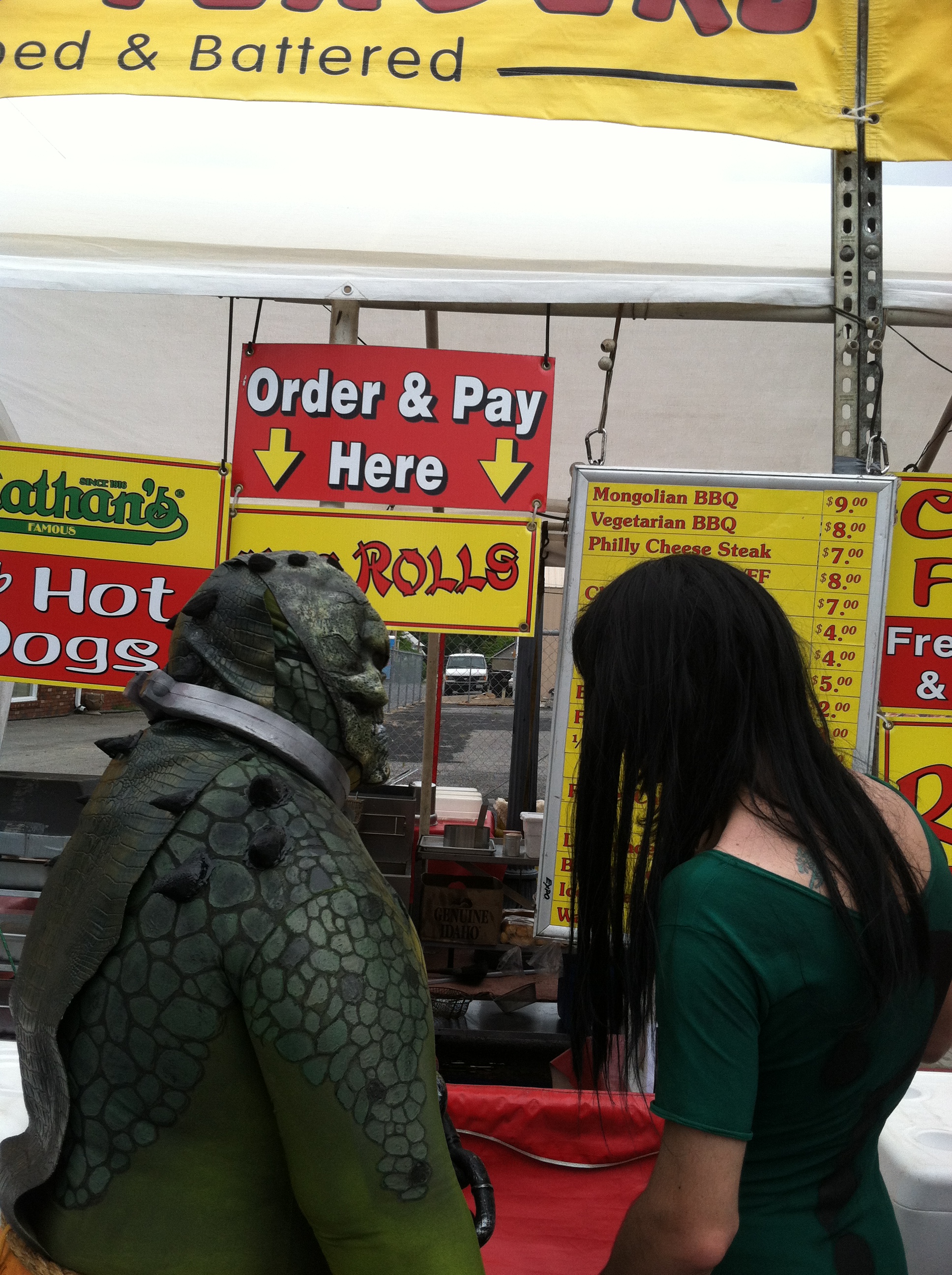 Some cosplayers could be found just waiting in line for food on Market Street. Supers have got to eat, too. (Apparently Killer Croc and The Riddler love fried fair foods, too!)