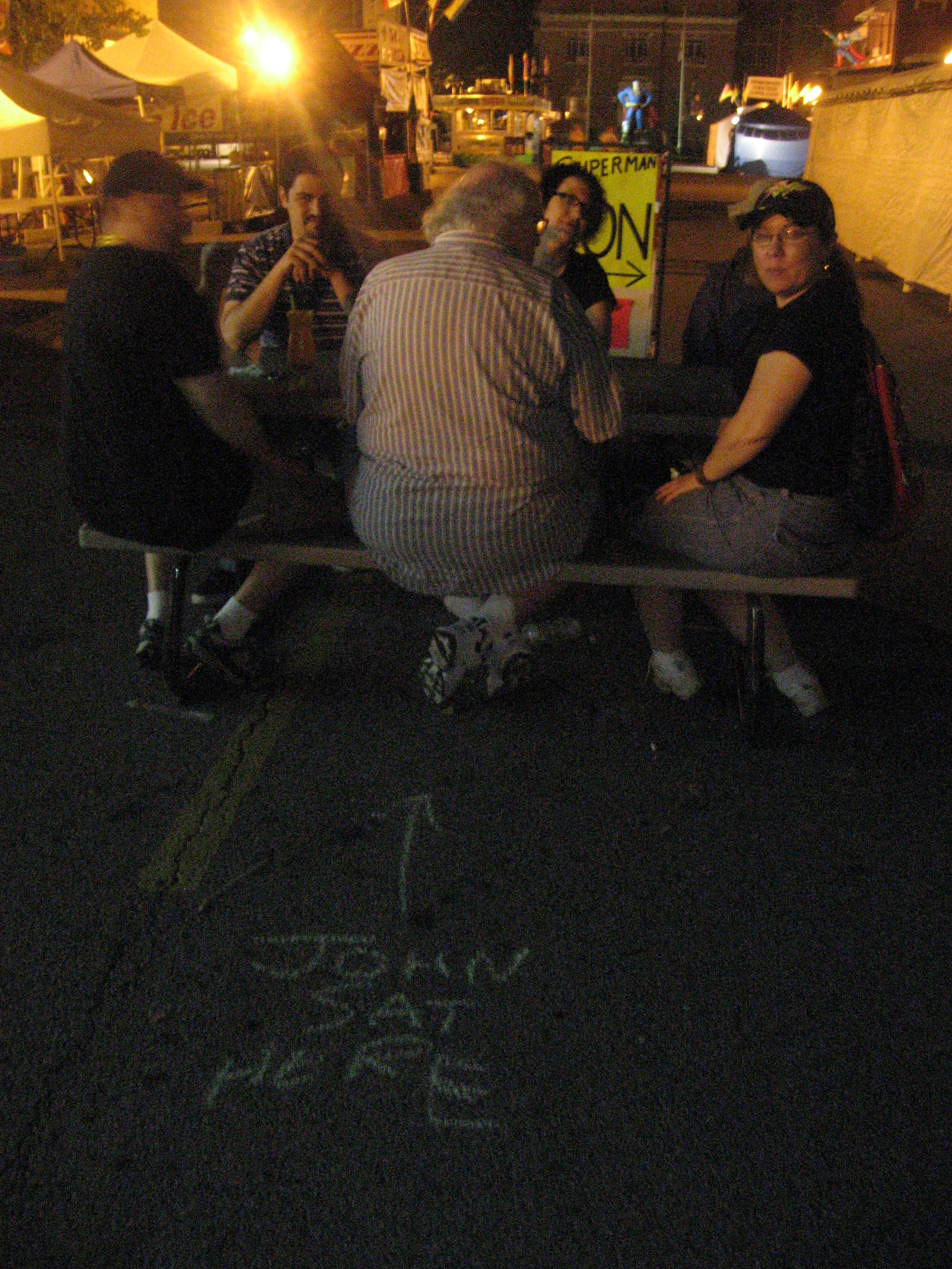 This was the third time I’ve been asked to be a judge (once with writer Marv Wolfman and a Paducah costume shop owner, another year with artist Murphy Anderson and my Bushi Tales partner Dave Beaty.) It’s a lot of fun and you have one of the best views of the main stage during the costume contest, but I’ve also found out it’s a great way to make enemies in Metropolis! If you’ve ever been a judge for any contests you know what I mean… 😉 (Can’t remember who took this pic from the 2008 stage, but it kind of gives you an idea of the crowd size at the contest! That’s Helen and Murphy Anderson, Dave, and me in the center.)