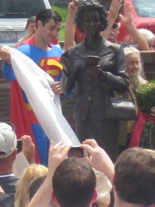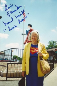 In 2009 Noel was in Metropolis again for the Superman Celebration, but this time to break ground for a new Lois Lane/Noel Neill statue– which was unveiled the following year in 2010 by Superman (Josh Boultinghouse). As you can see, the statue is a bit bigger than Noel- because Noel is larger than life. 😉