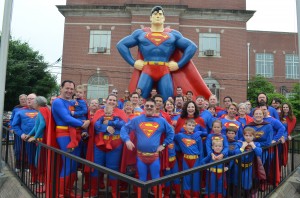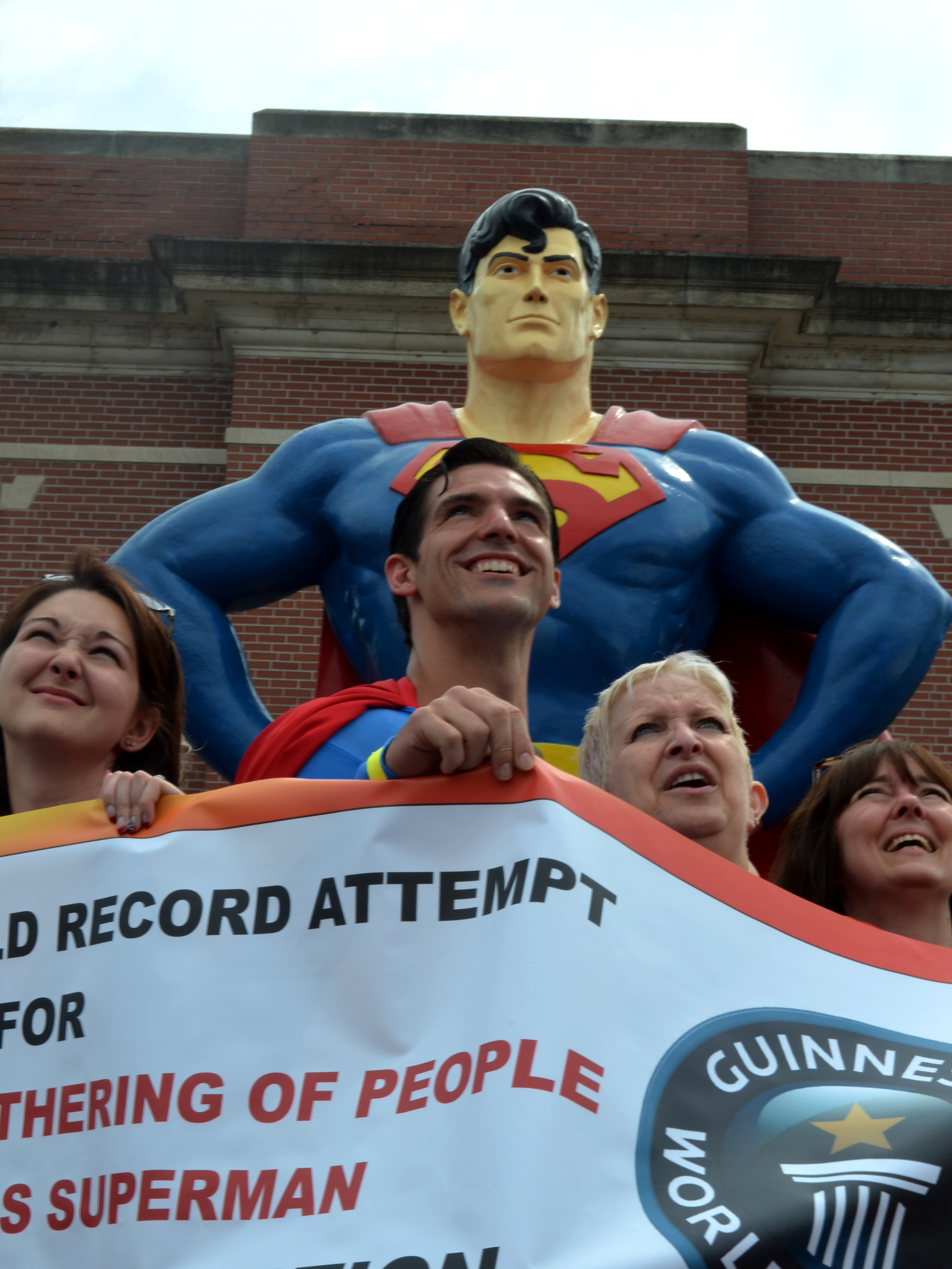The group in Metropolis beat their old record set in 2008 of 122 (I was one of the original group) by having 268, but didn’t beat the current record of 566 set by Sears employees in Chicago just a few days before this year’s attempt in Metropolis. The old record was 437 held by a group in Canada after they broke the previous record of 180 in the UK, which is the one that broke Metropolis’ original record. I think it’s great that the record got started in Metropolis, but think that it’s even sweeter that it has been attempted by Superman fans- not employees of a company who were given costumes as a promo/tie-in with the “Man of Steel” movie.