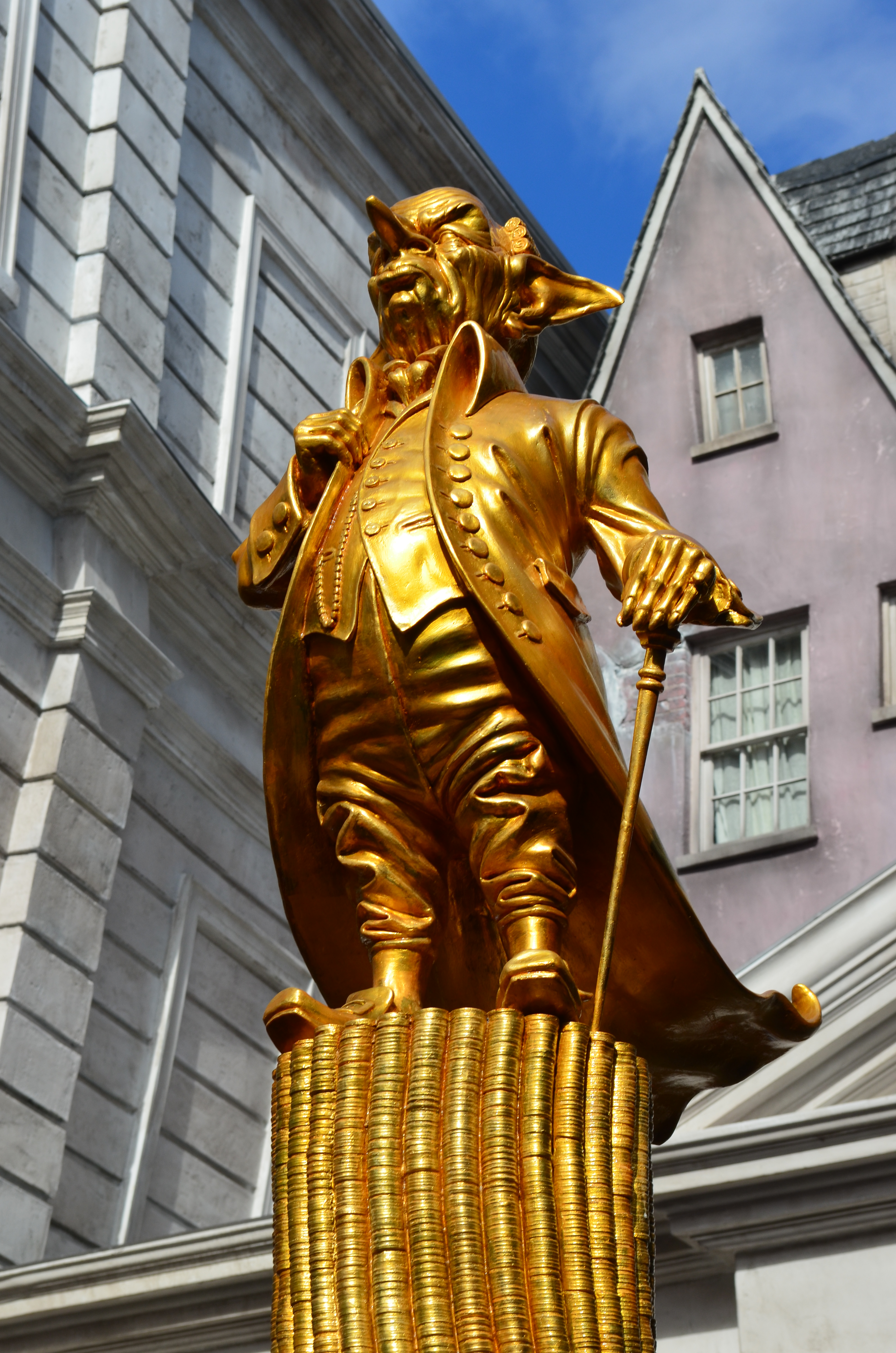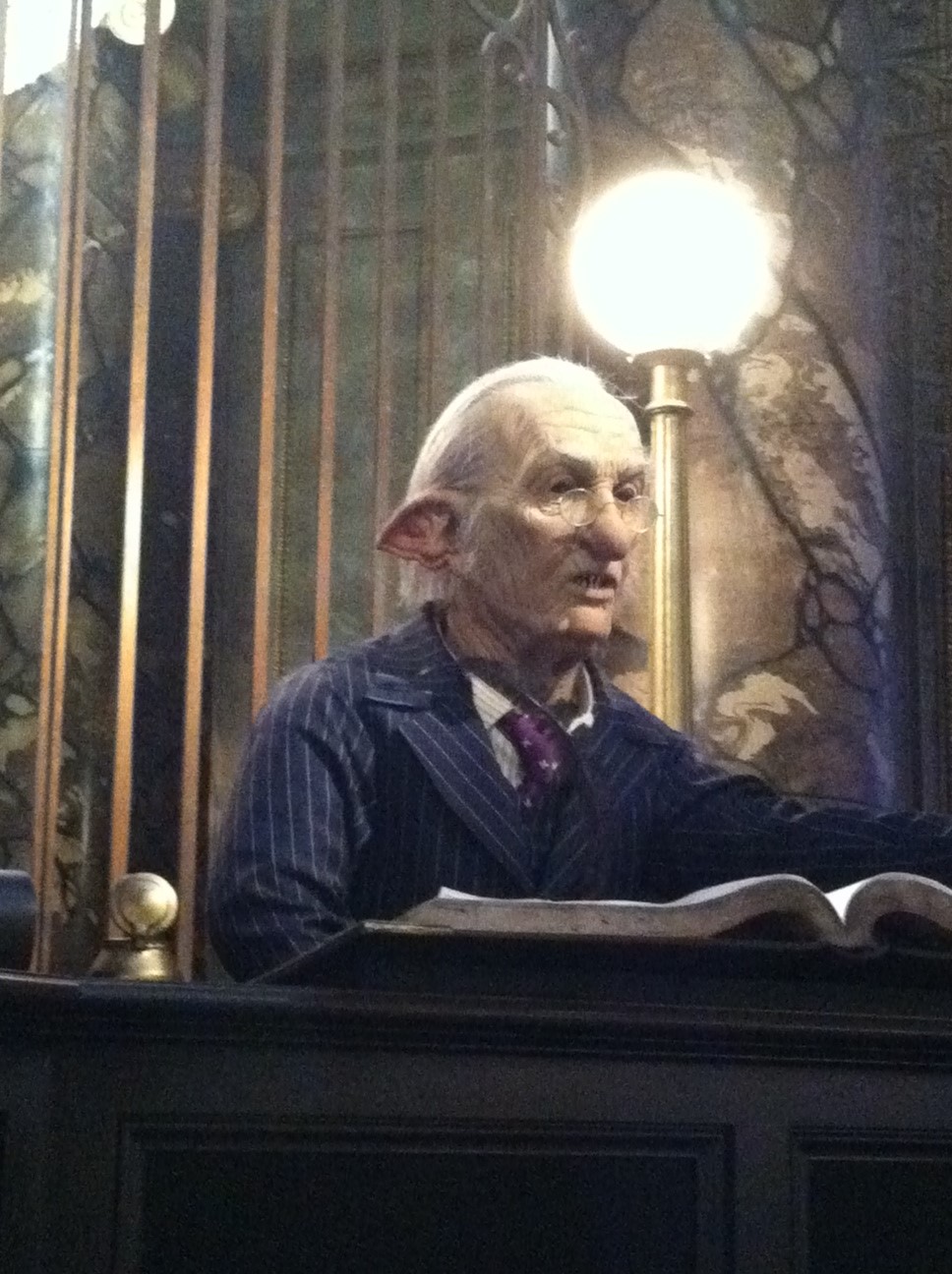 Atop Gringotts sits a huge dragon! Outside ofthe bank on the left is Hagrid’s flying motorcyle/sidecar, and on the right before you enter the bank stands a grand statue of Gringott himself (the goblin who founded the goblin run bank back in 1474) on top of a pile of gold coins. Before getting into the queue line for the ride, we were instructed to put larger valuables in a locker which were just outside the bank behind the statue. After all, like Hagrid says- “Gringotts is the safest place in the wizarding world.”