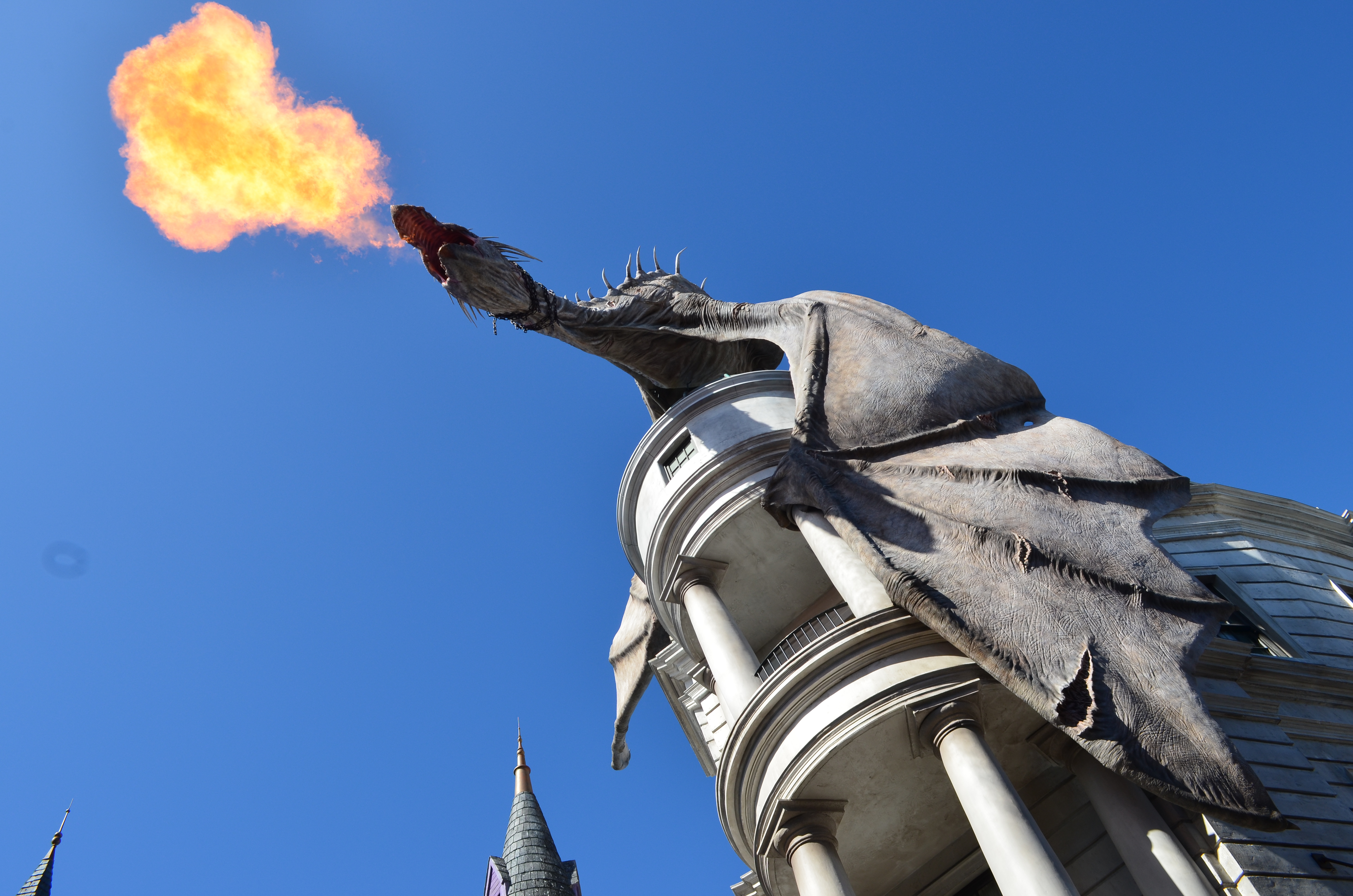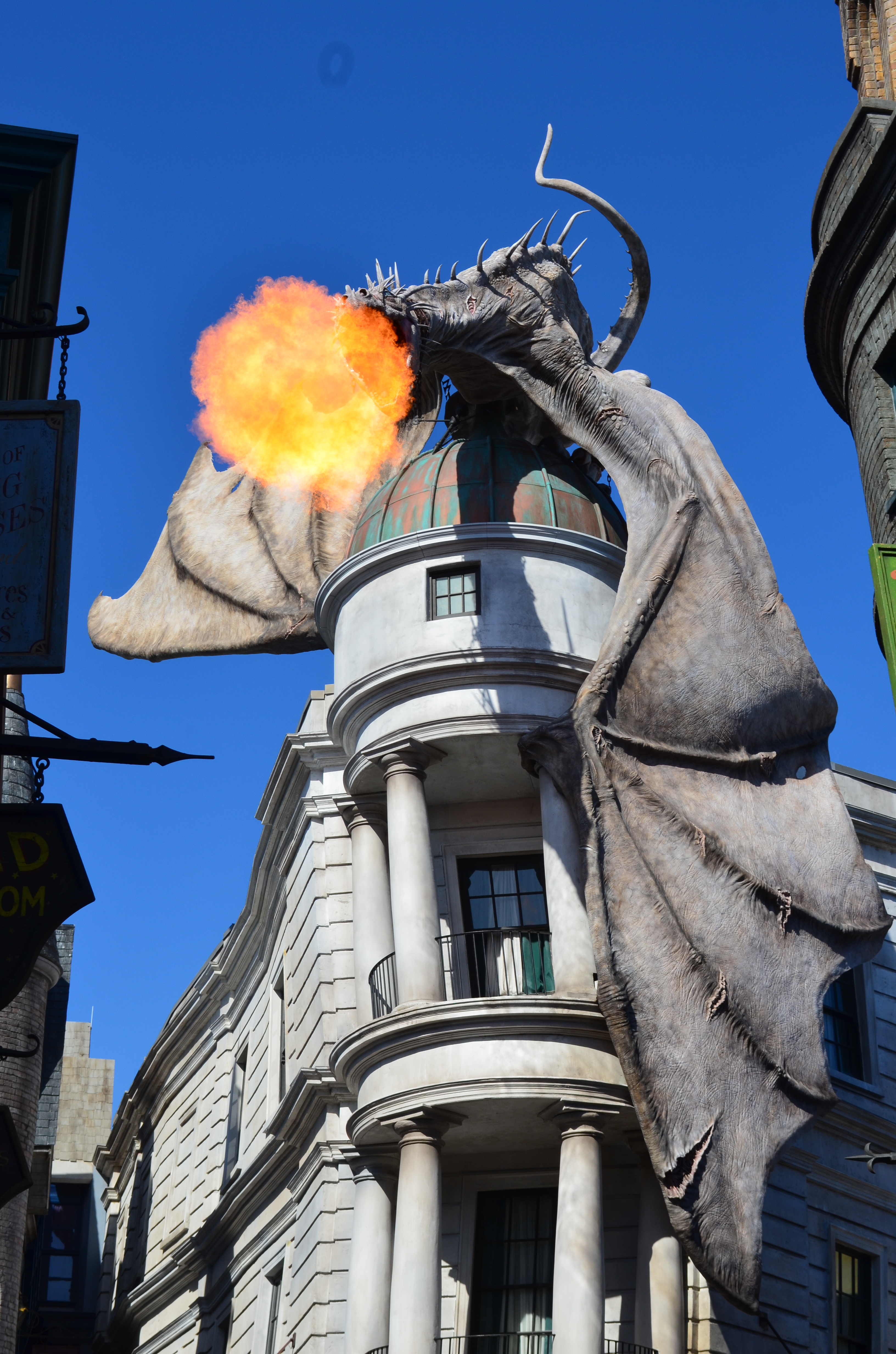You meet a goblin named Blordak, and then Bill Weasley greets and escorts you as Voldermort and Bellatrix chase after you during the ride, and you encounter security trolls and the half-blind white fire-breathing dragon who guards Gringotts. The attention to detail throughout the park is amazing, and this ride had plenty of its own from front of the queue line, to the bank lobby, throughout the ride, the gift shop as you exit, and especially outside the building…or to be more exact what was “on top of the building”!