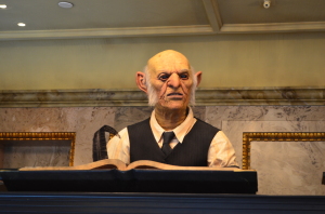 Another animatronic goblin teller sits behind the counter and interacts with customers.