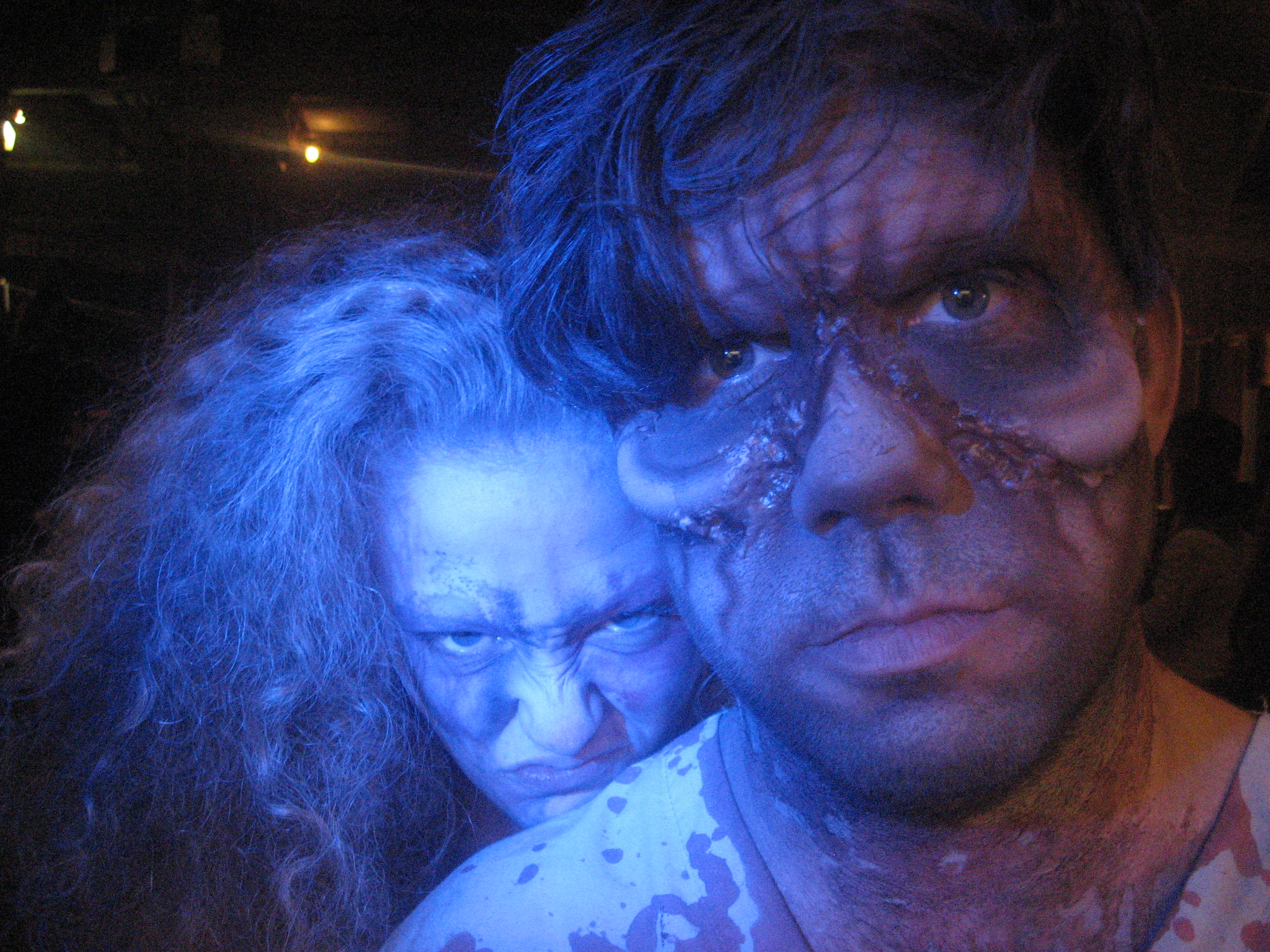 Speaking of the haunt, I’ve had several occasions where people just lose any self-control- either from alcohol, fear, adrenalin, or just trying to be a bad-ass in front of their friends. I’ve been hit one time, tripped up, had people run into a scene swinging their arms around threatening to hit anything that’s gonna jump out at them! We have security cameras, security people, and don’t like to have people act alone in scenes to try and keep our scare crew safe. Our general rule is no touching– by guests or crew. I’ve had scared victims- uh, visitors yell at me, “You can’t touch me! YOU CAN’T TOUCH ME!” My response it always, “I don’t have to touch you to kill you..!”