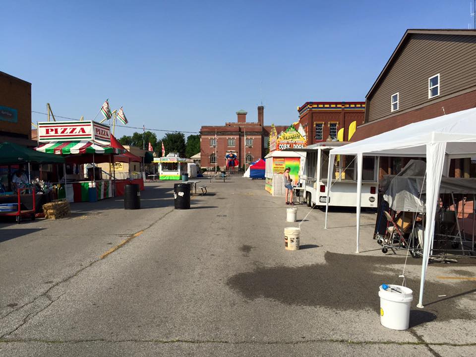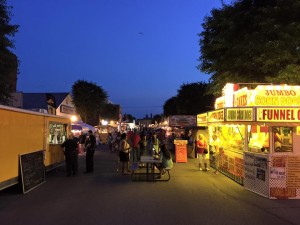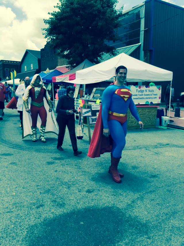 Temporary sign and spot lights illuminated Market Street, and the aroma of fair food filled the air. Corndogs, funnel cakes, cheesesteaks, Mongolian BBQ, lemon shake-ups, ice cream, souvenirs, and more were available along the 3 block stretch from 8th Street to Superman Square and the giant Superman statue in front of the courthouse, Metropolis Chamber of Commerce, and Supermuseum.