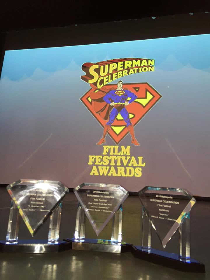 This year I was in town not only to run around as a fanboy and eat myself silly, but to help my buddy Tim Brown set up the outdoor movie screen and help run the boards for the Superman Celebration Fan Film Festival Awards, or as they are now known- the Superman Celebration Film Festival Awards. The first fan films were shown outdoors in Superman Square back in 2007, and the first annual Superman Celebration Fan Film Competition was held the following year in 2008.