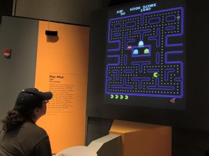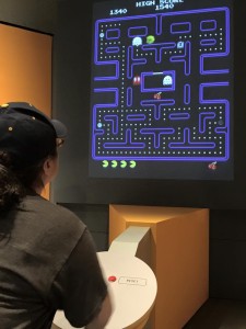 We decided to head downstairs to galleries 2, 3, and 4 and work our way back up through the museum. We were greeted by a large mural of the exhibit logo- which resembled a large Pac-Man game.