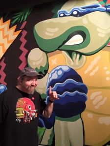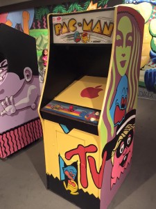The mural was great, and fun to pick out all the different characters depicted in the art. Each video game cabinet had been painted with different characters or themes. This part of the exhibit was called “Buggin’ & Shruggin: A Glitched History of Gaming Culture” and was done by artist artist Michael Roy/Birdcap Shruggin. I thought it was all cool, but I overheard several kids complain that “they didn’t work“. Oh, well- kids and art.