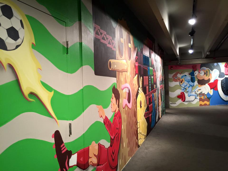 After the main gallery with the gaming, art, and interactive displays was a room with custom painted old style stand up arcade game cabinets in the center, and surrounded by walls covered floor to ceiling by a video game themed mural.