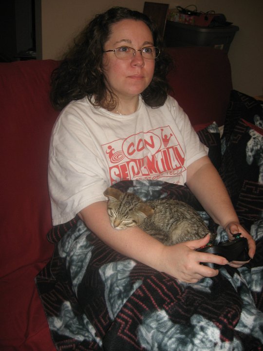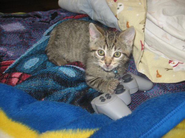 Funny thing, when I met Nicki for the first time she was playing on a friend’s system and kicking the crap out of another friend. I new right away this girl was serious about her gaming. She even turned one of our cats into a gamer!