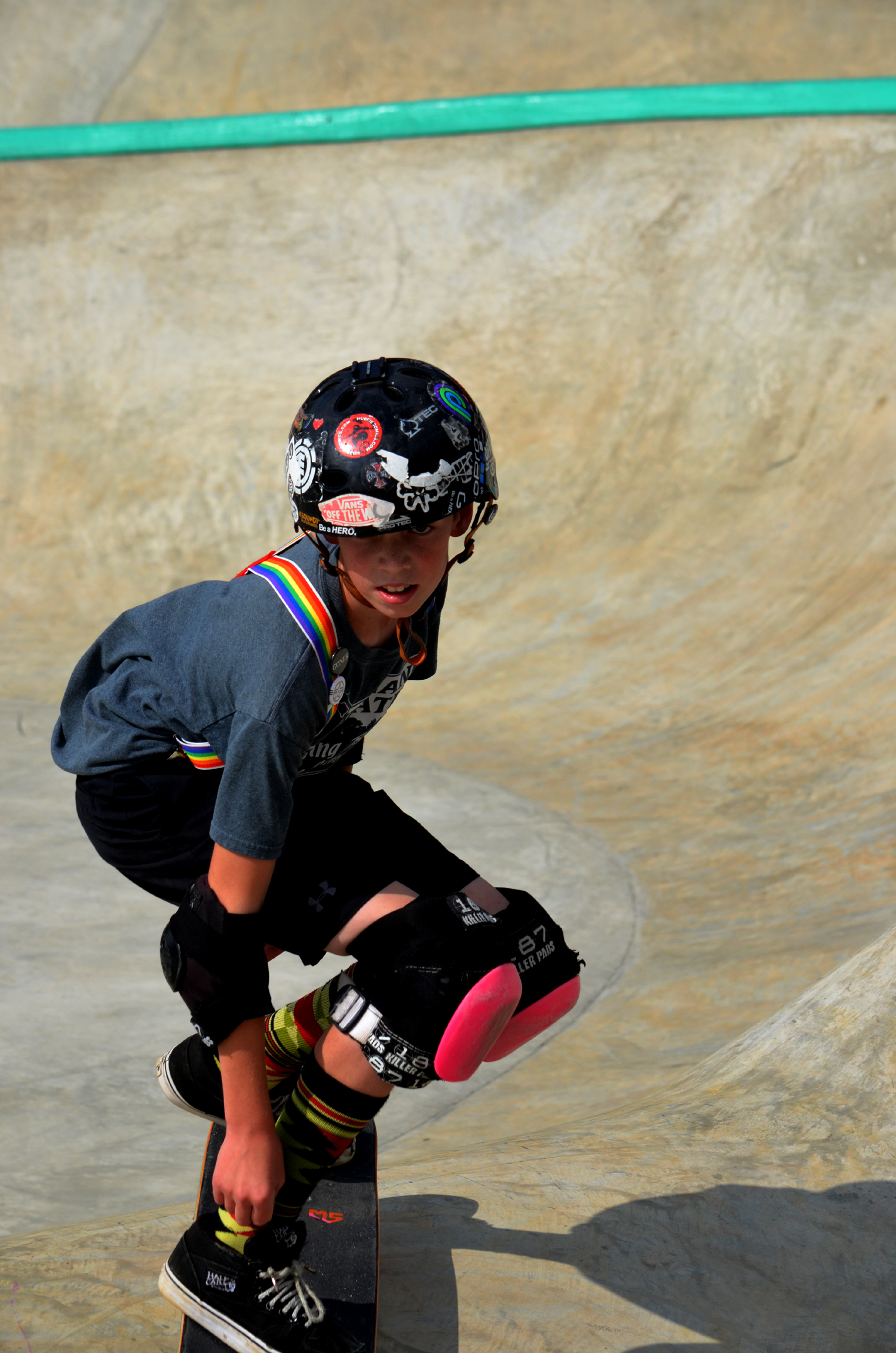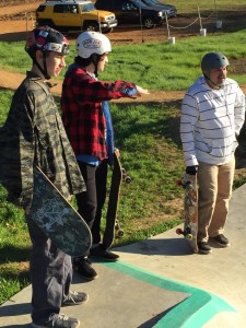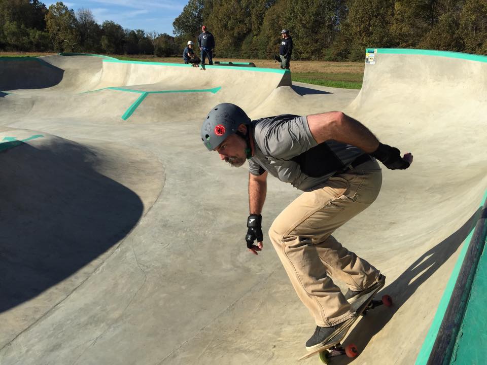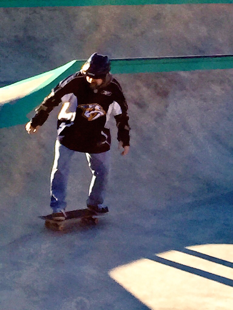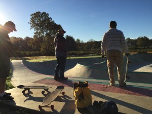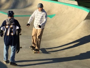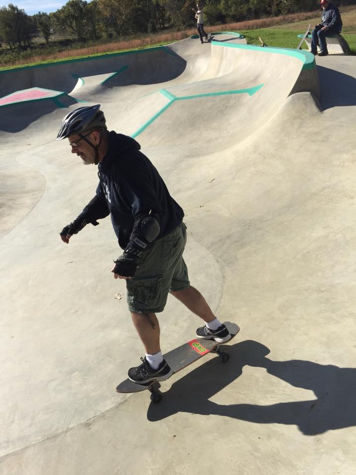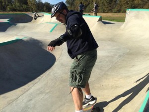 We offered Kevin some extra elbow pads but he declined…until he wiped out in about the same spot I did! He put on the pads and continued skating, occasionally playing “follow the leader” with Greg. Mike decided to watch from the top of the park. Again, I stayed in the shallow end. My wife is constantly having to tell me I don’t bounce or heal like I used to.