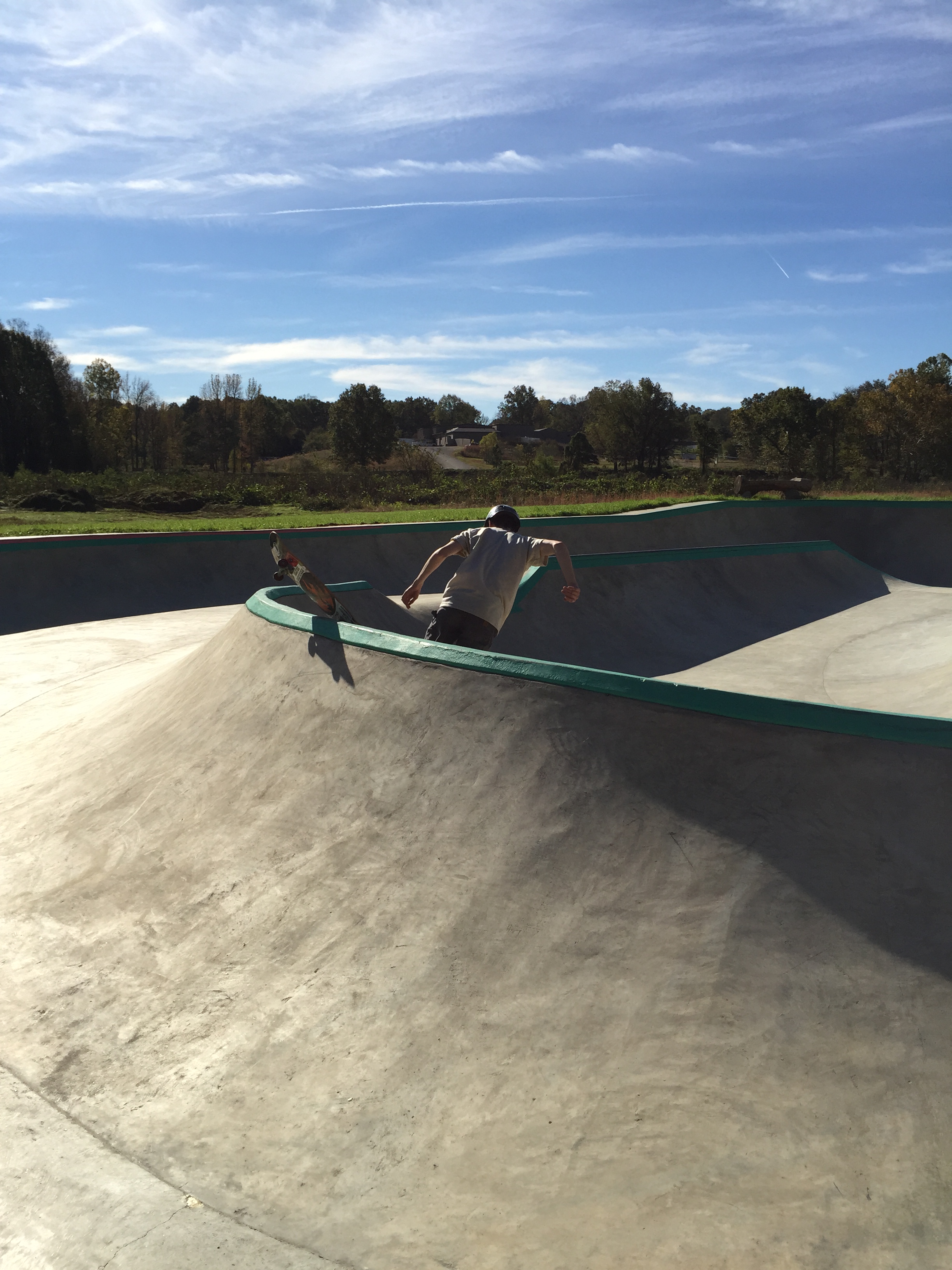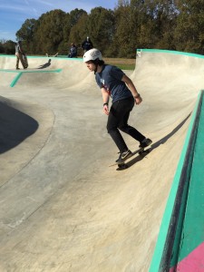 It was a bit intimidating to me at first than I thought it would be. I mean, c’mon- I saw kids skating it a few weeks earlier. How hard could it be, right? Straight skating was fun, but anytime I got near a bowl or started up a side it freaked me out. The sides and bowls of the park seemed a lot deeper and steeper once inside it.