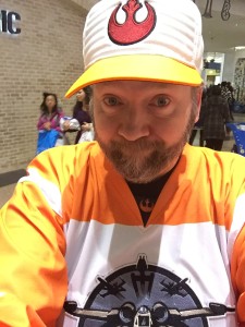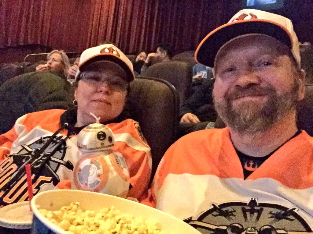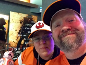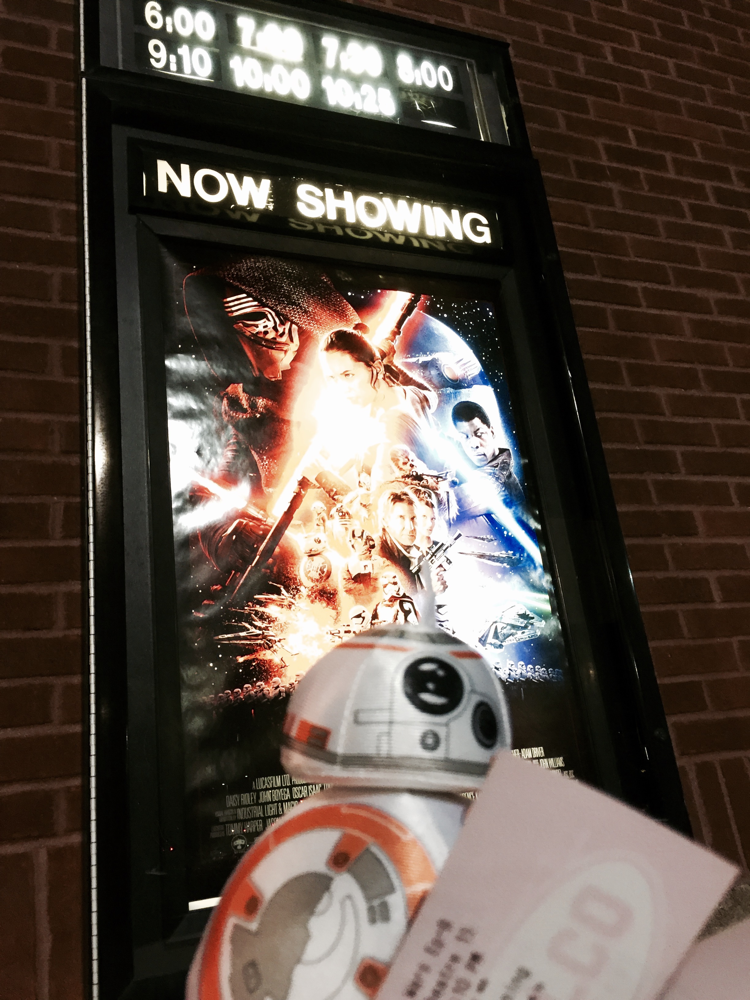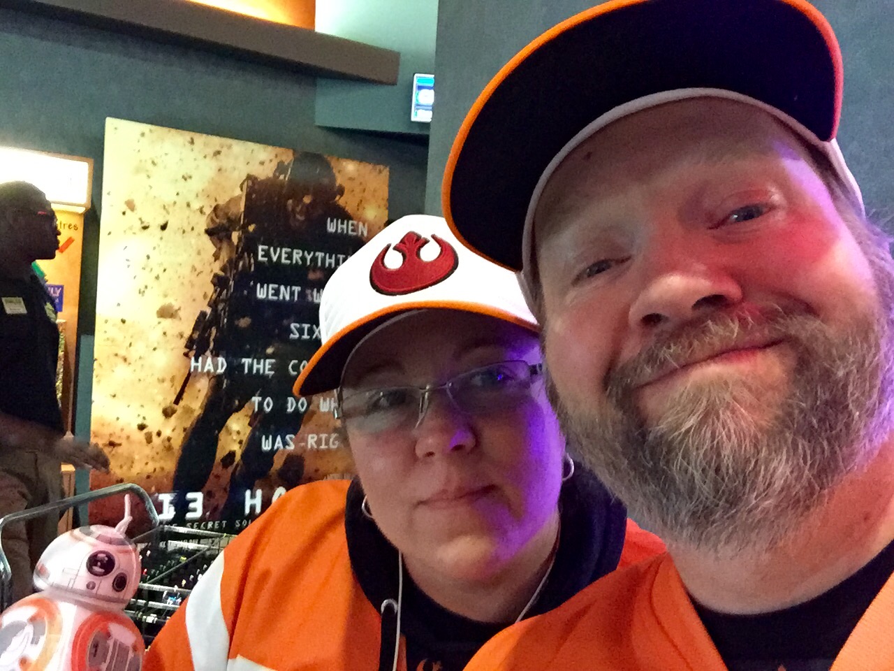I first got to see Star Wars: A New Hope (or just “Star Wars” as we called it back then) when I was around 11 years old in 1977. I went to this latest movie at 49 years old. The 11 year old me had no idea what to expect going into see Star Wars, while the 49 year old me had all sorts of expectations- as well as an internet to avoid spoilers on the week before the movie officially opened. Gotta admit, just like watching the original trilogy(OT), or prequels, or Special Editions, the 11 year old in me comes out every time I see these movies on the big screen. When the Star Wars logo first appears in front of me followed by “the crawl“, well- it’s time-traveling and real movie magic for me. Ah, but the 11 year old me didn’t have a day job and was used to staying up late to watch movies. Sadly the 49 year old me just can’t hang like that anymore. Last week my wife did a Star Wars movie marathon at our house showing each of the previous 6 films, and I fell asleep during the last three we watched at night. It’s not that I find them boring- I love the OT, but due to my day job I’m up around 5:30am or earlier each morning and in bed by 10pm. If I’m sitting on the couch I can easily be out by 8 or 9pm, and I just can’t stay awake for midnight showings at the theater anymore. So when my wife Nicki said she got tickets for a 9pm showing on a workday for us, I just didn’t know if I could go do dinner, make it through the movie, go hang out with friends after, and then drive home. I can happily report, that while the movie did test the abilities of my bladder towards the end (I bought large sodas for us), The Force Awakens did keep my attention and keep me awake.