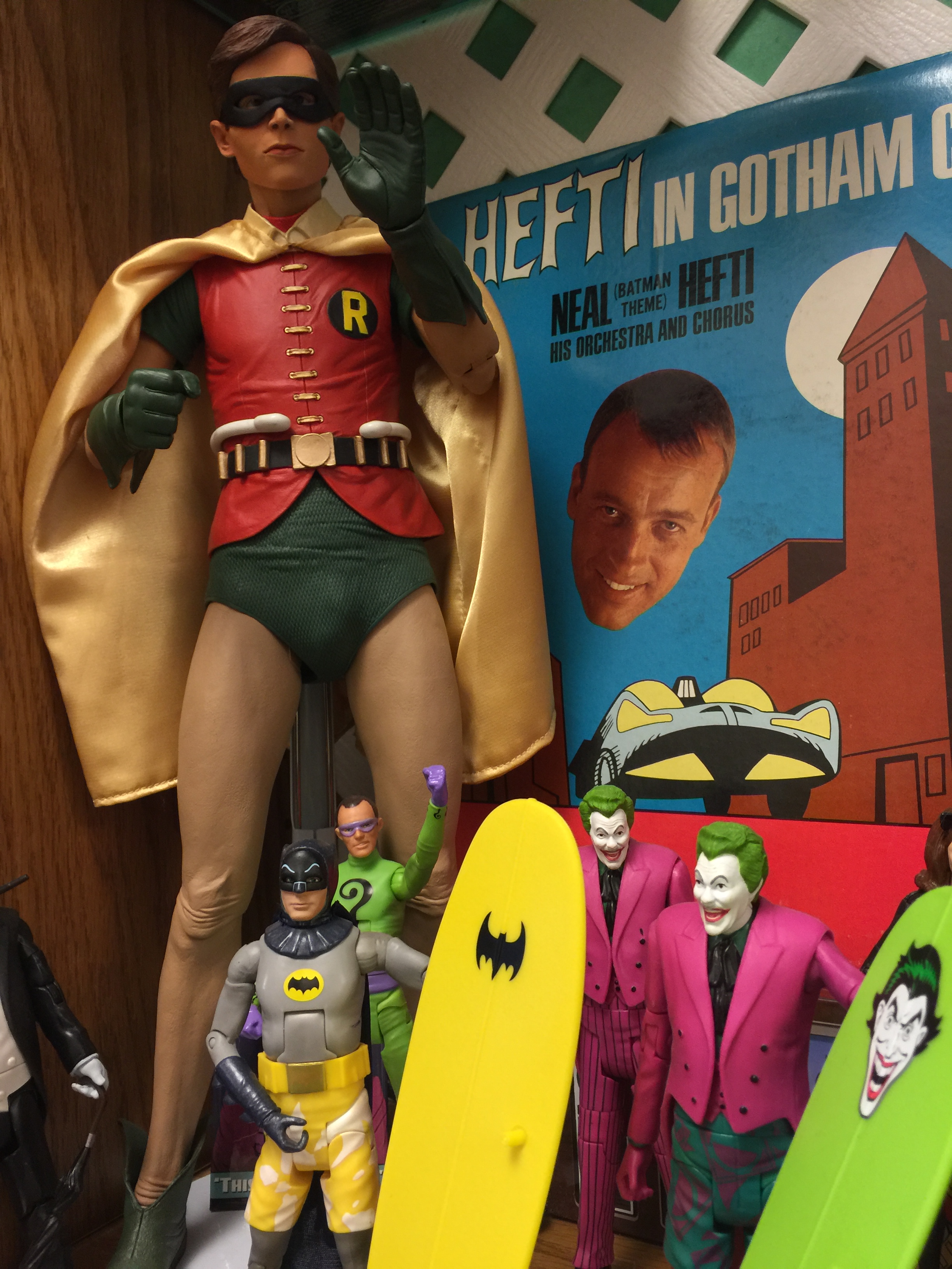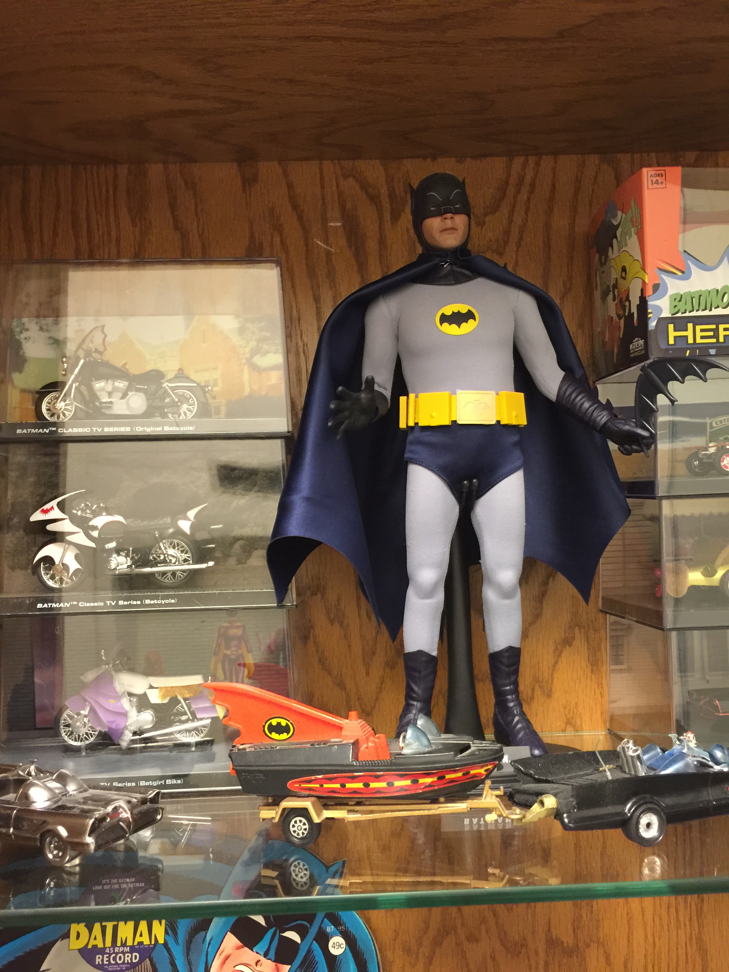 These two figures are my Hot Toys Adam West Batman and Burt Ward Robin. There are Eaglemoss bat-vehicles in the stacked plastic cases with them on the top shelf.