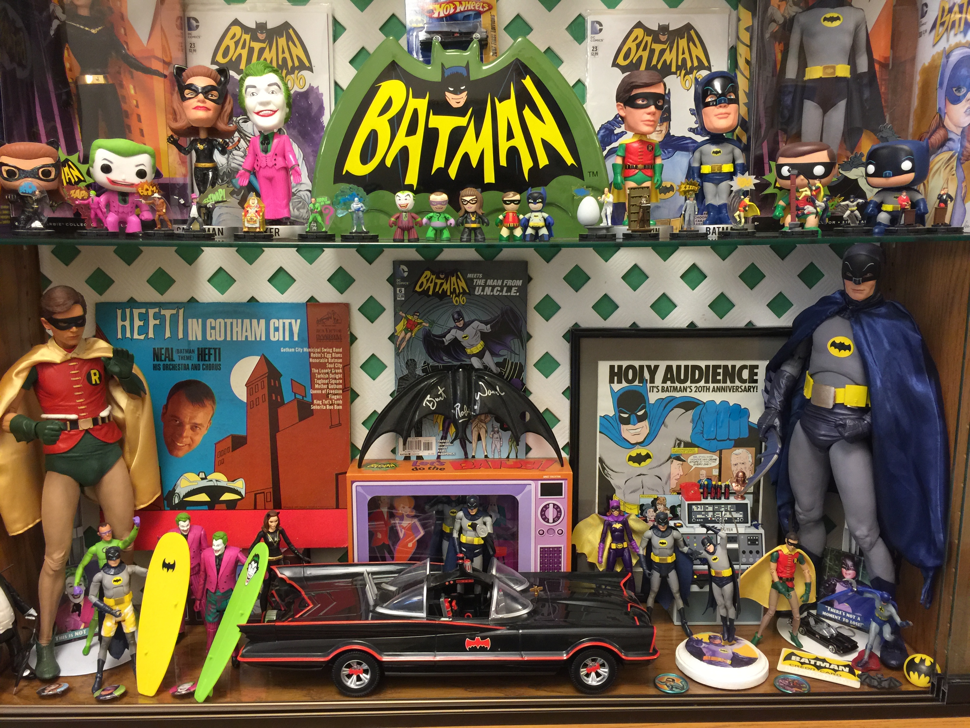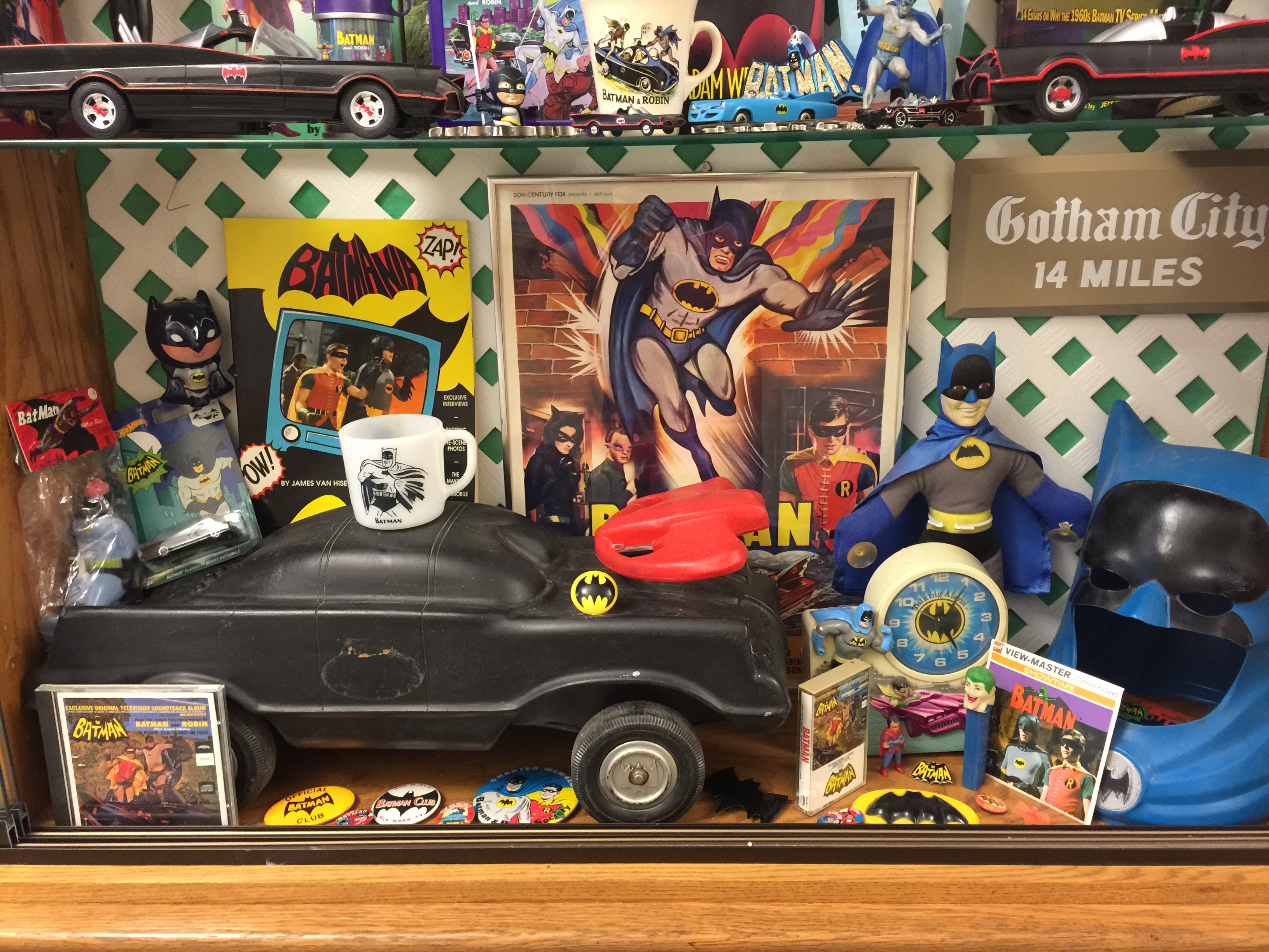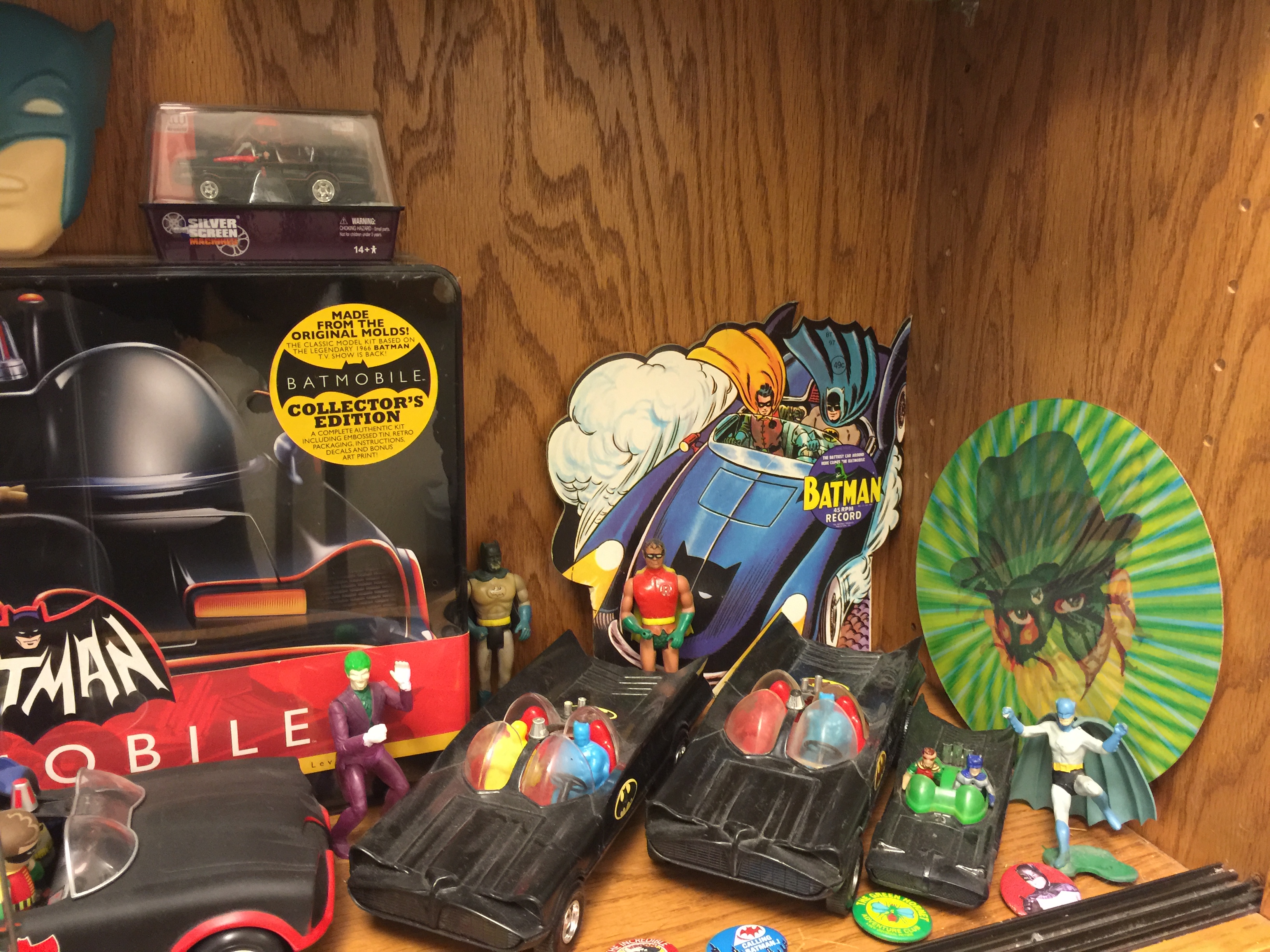 Those are a couple of Batman and Robin records, plus some Corgi, Corgi Jr., Hot Wheels, Matchbox, Avon, and Funko bat-vehicles on the middle shelf. Picked up the metal Batmobile sign at Hobby Lobby recently.