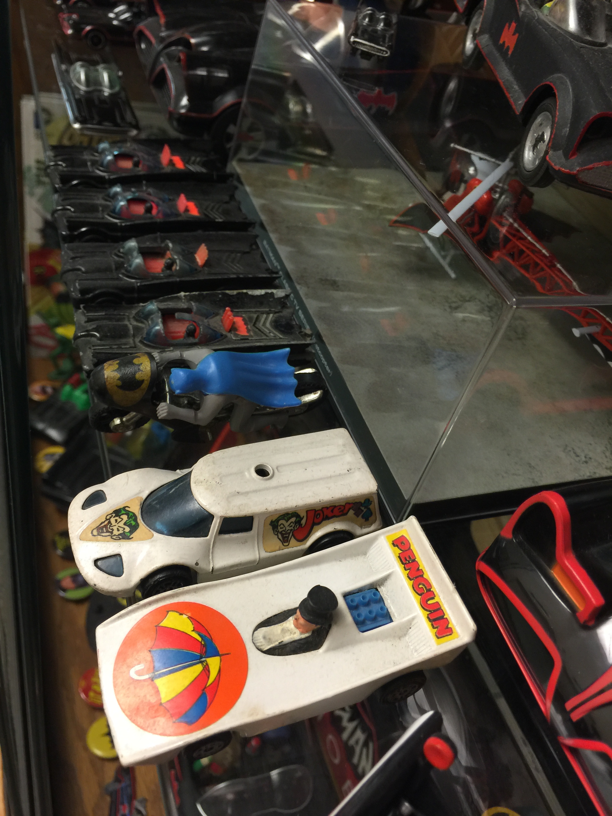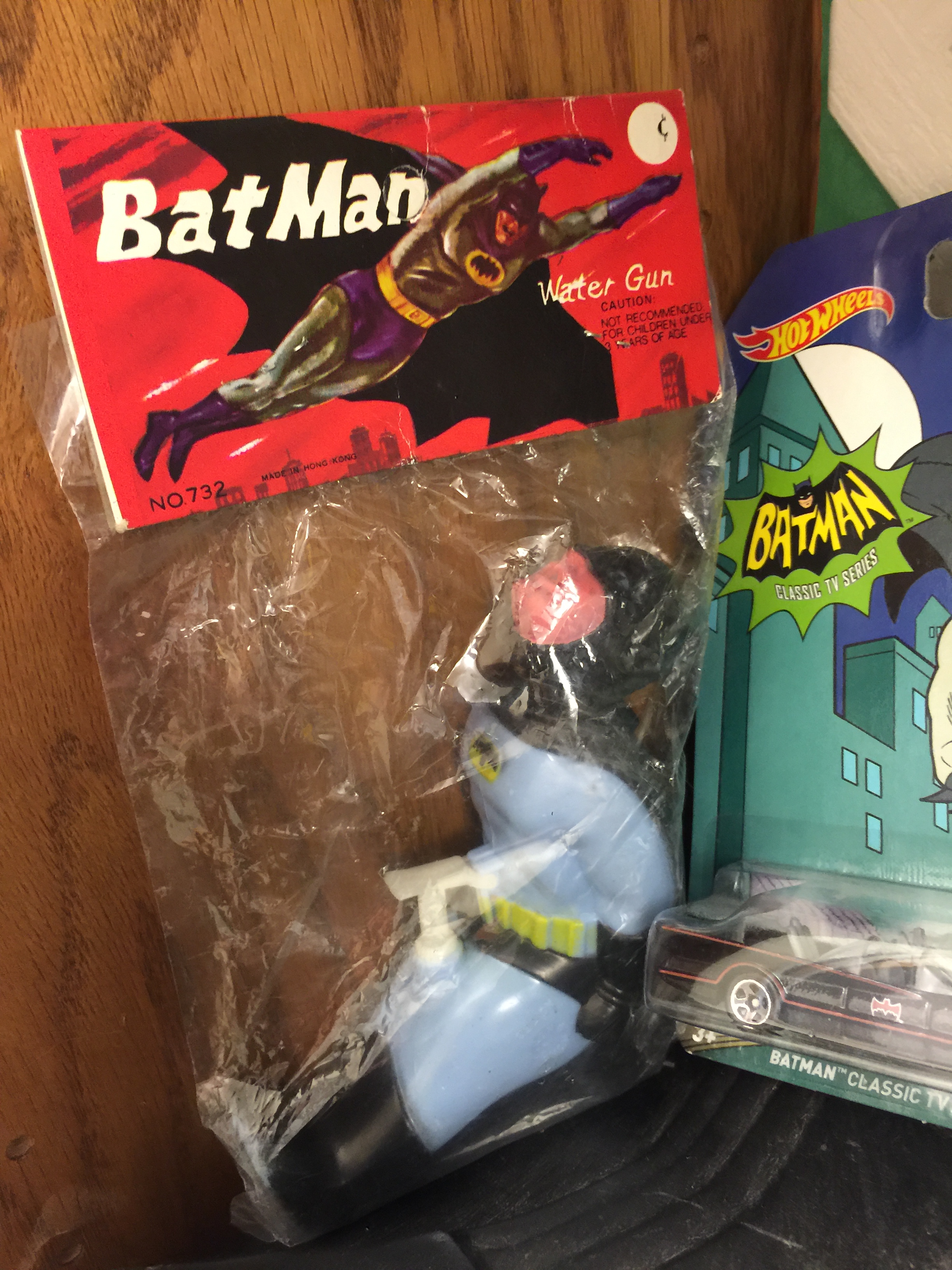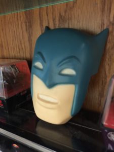 The sign above is a replica made by Lee “The Batfan” Johnson. I have a matching Joker to go along with the suction-cup Batman below it. The blue and black Ideal Bat-helmet is one of my prize possessions. Another item I wanted as a kid but didn’t acquire until a few years ago. The squirt-gun on the right is an item that cracked me up the first time I saw it and I knew I had to have one. It’s just too weird to not have one in my collection.
