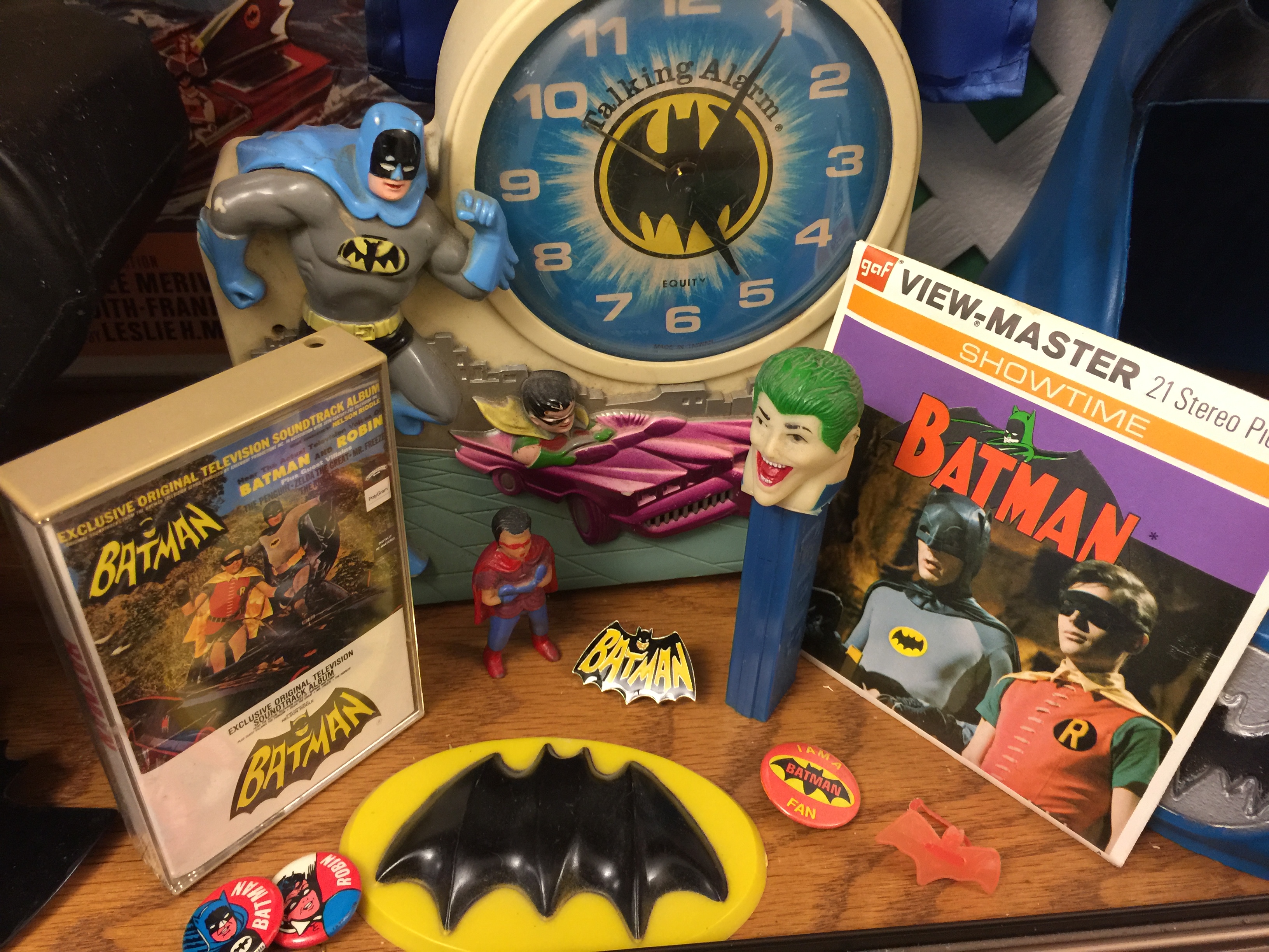 The alarm clock in the middle is something I’ve always wanted since I was a kid. A friend had one and it would wake us up in the mornings when I would spend the night at his house. Unfortunately mine doesn’t talk anymore, but I hope to get it working again someday. The Joker is an older PEZ candy dispenser, and there is an older bat-ring, button, and bat-logo from a cake pan set I had as a kid. I also like collecting View Master reels The ones above are from a Catwoman episode.