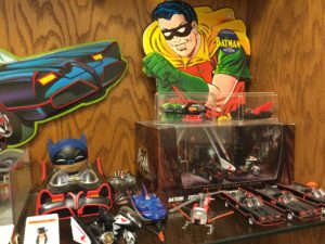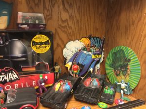 Along the bottom shelf there are a few larger plastic toy Batmobiles and Batboat, a Batmobile model kit, 45 record, lenticular Green Hornet disc, Pocket Heroes figures, buttons, slot cars, “Batman Meet The Green Hornet” trade paperback, and an awesome new George Barris car book- “King of the Kustomizers: The Art of George Barris“