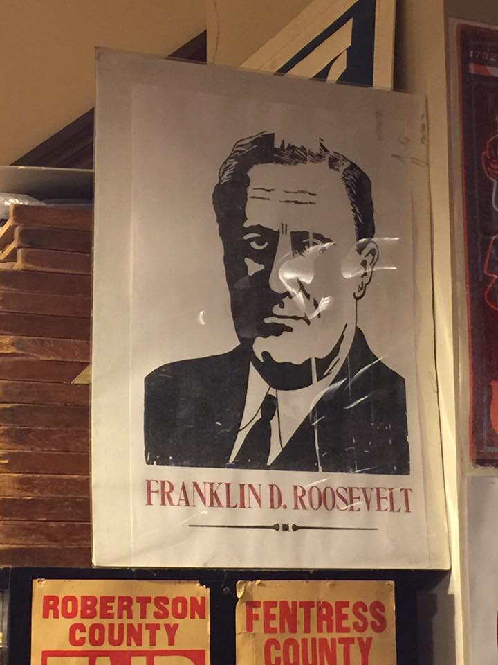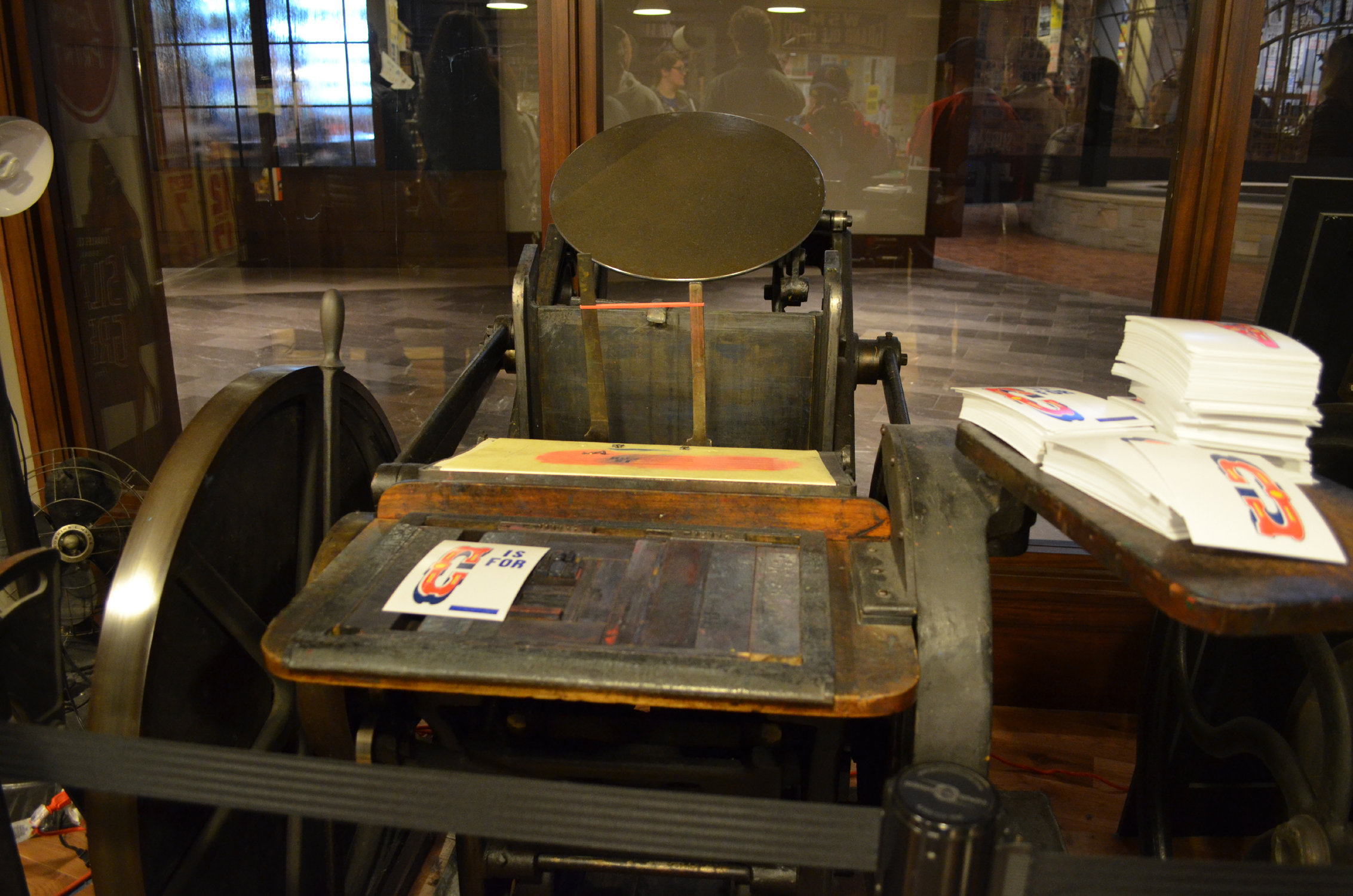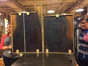 We had two very knowledgeable tour guides and printing instructors. Both work in the print shop. The two wooden plates they are holding above were used to print posters for the Hoover/FDR presidential election of 1932.