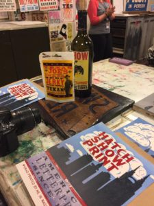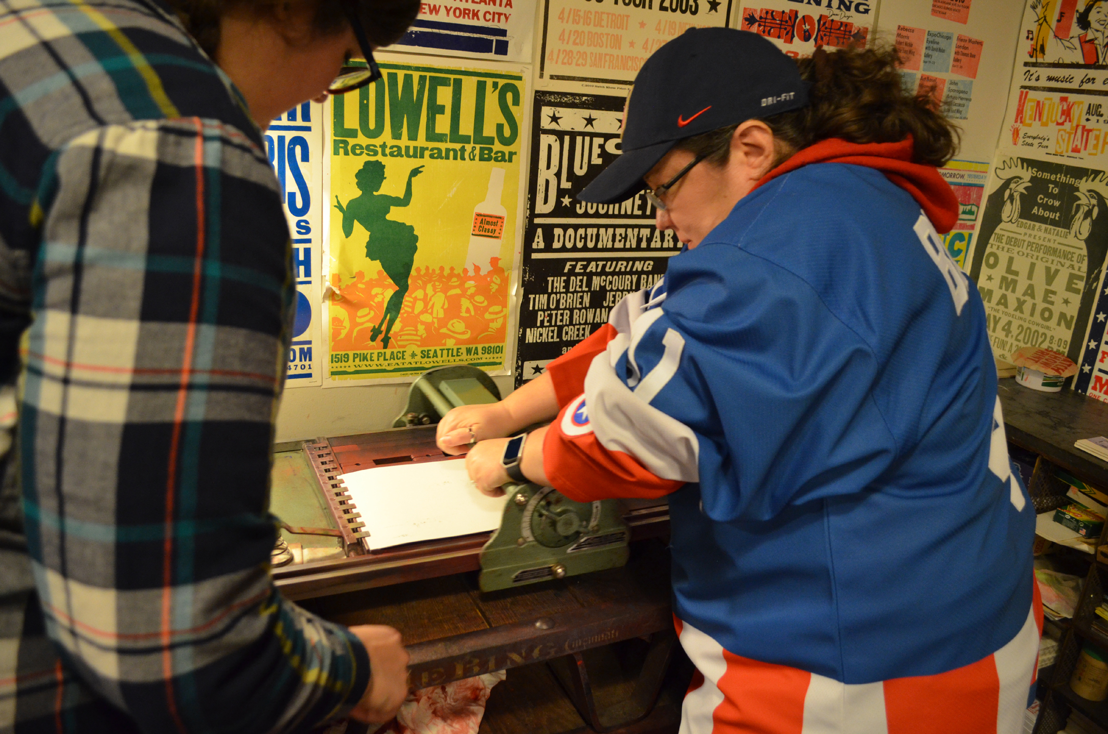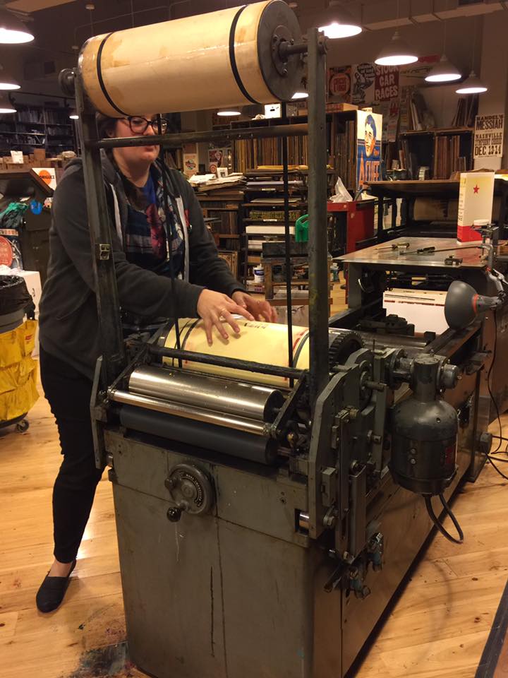 I started screenprinting about 30 years ago, and have been involved in all sorts of silkscreen, offset, and digital printing– comic books, art prints, CD covers, stickers, tees, jackets, and more over the years. I always love visiting other print shops and this was the first time for me to experience one as unique as Hatch. I’ve never done any letterpress printing like Hatch does. The closest I’ve ever come to doing any printing like this was an art project in the 7th grade where we cut out images using Styrofoam trays, painted them with acrylic paint, and then pressed them onto colored paper to transfer the paint.