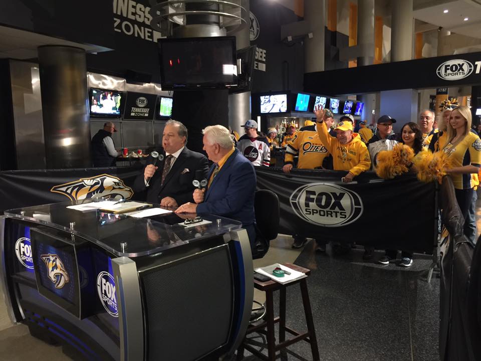 While Nicki was taking shots of the Predators’ pregame on-ice warm ups downstairs, I was hanging out in the lobby watching Mark Howard and Terry “Crispy” Crisp do the pregame show on Fox Sports South.