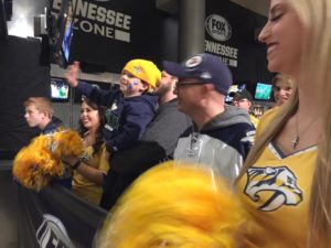 I joined in with some fans and a couple of the Nashville Predators Energy Team girls. The guy in the middle with the ballcap on came down from Winnipeg for the game. He said he hadn’t thought about ever visiting Nashville until he saw the past NHL All Star Game Weekend in Nashville (I still need to do a blog post about that trip). After watching that on TV he said he needed to come see the town for himself. We all were on TV behind Mark and Crispy. That was the first time I’ve gotten to do that and it was a lot of fun.