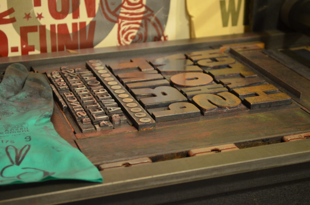 Each of those wooden blocks were hand carved (in reverse) and then used to print posters like the one above. The presses in the shop all have a lot of mileage on them. The press on the back right in the photo above is one that originally ran on steam, but was converted to use electricity and still runs today- pretty amazing..!