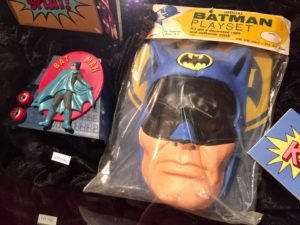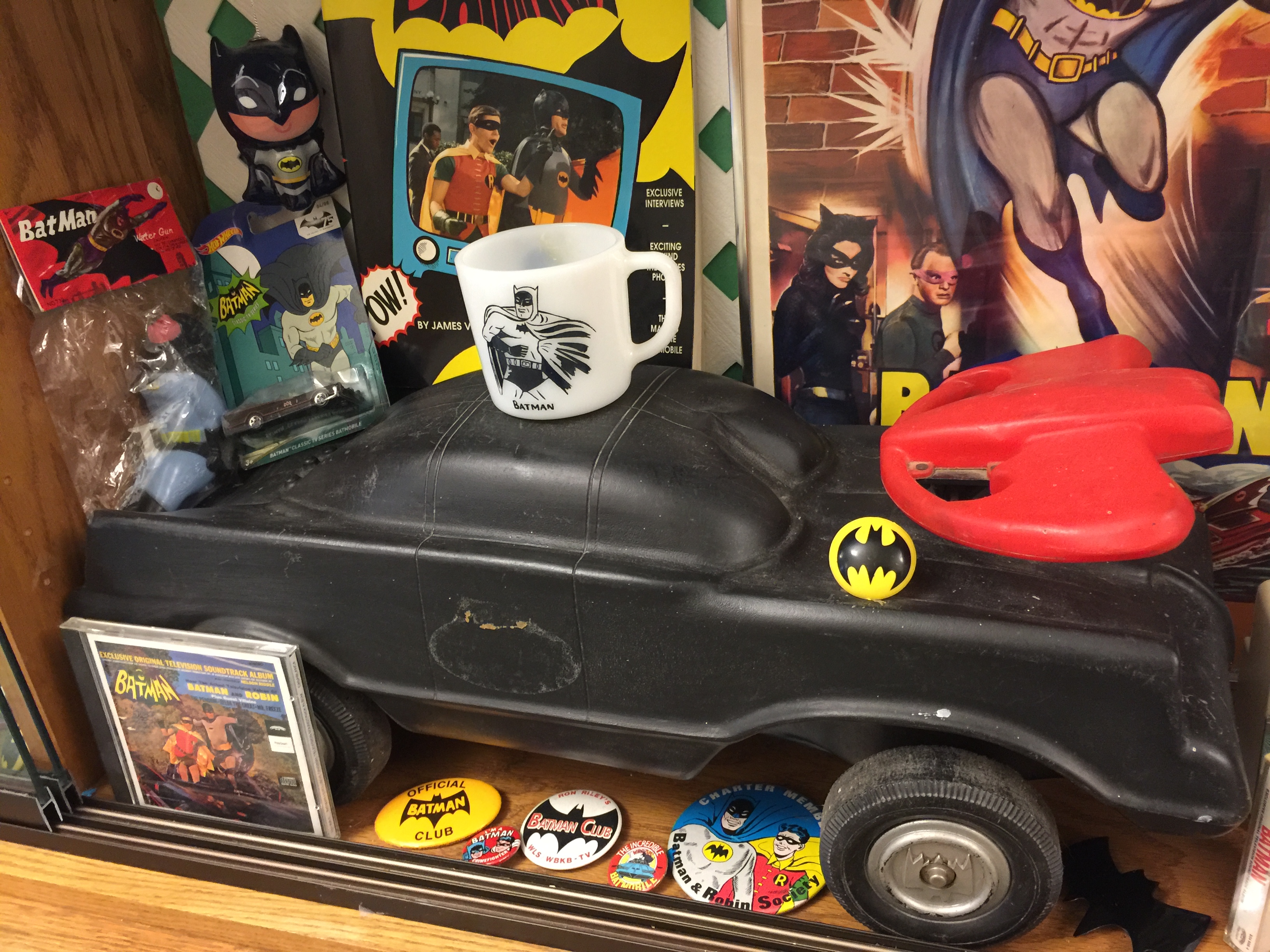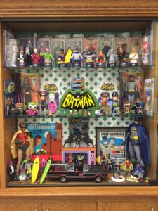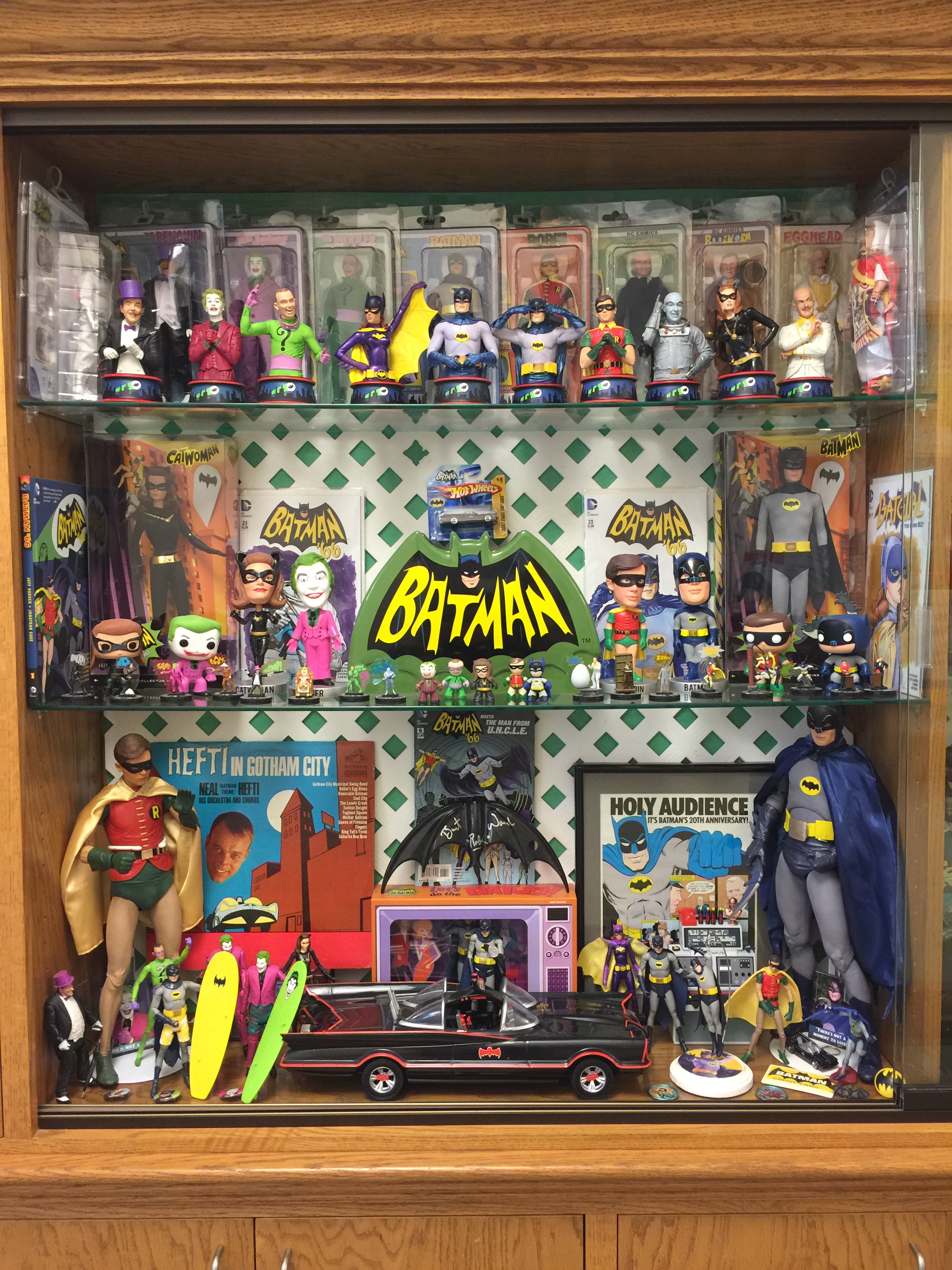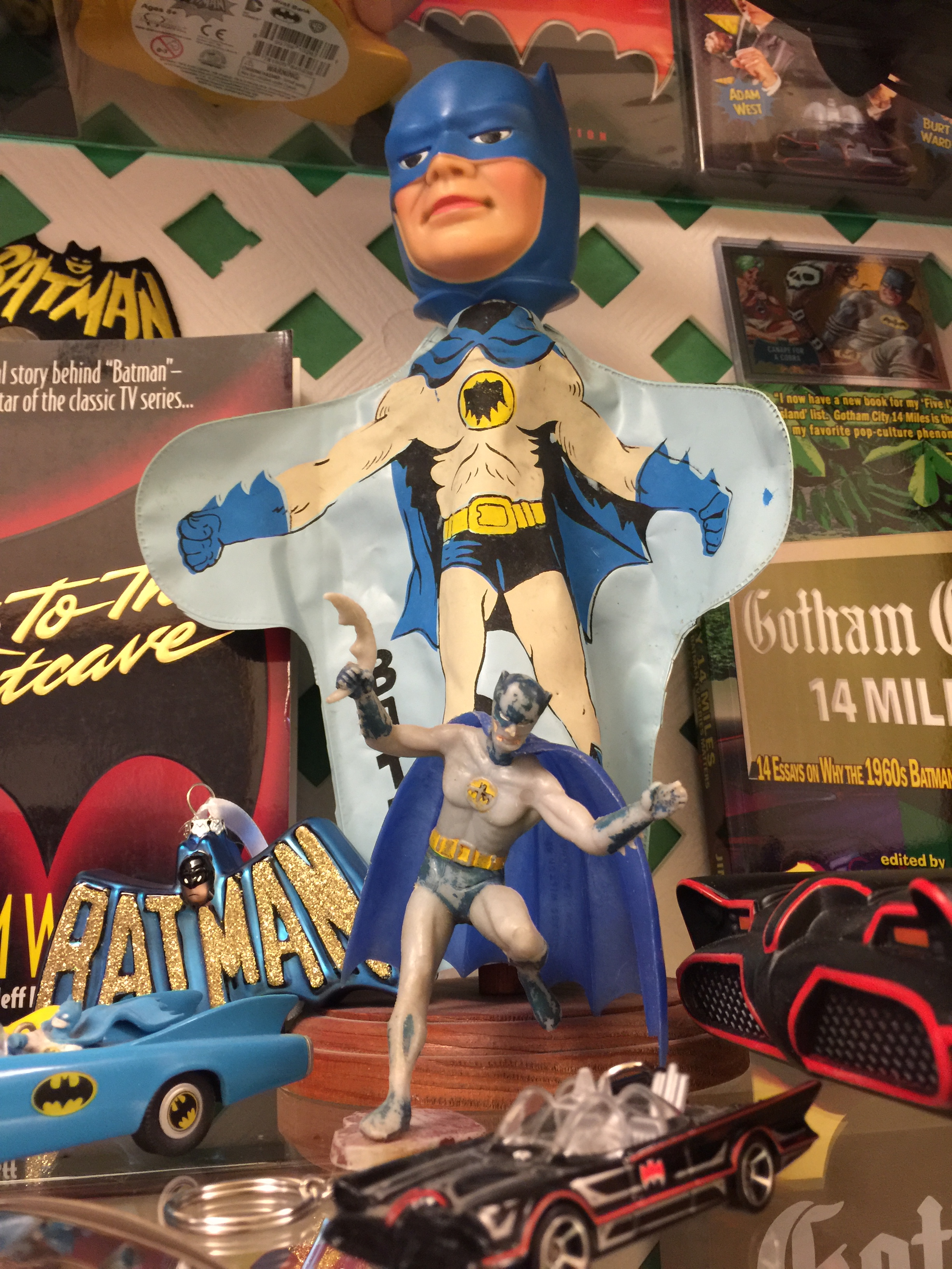 This small Batman figure above started my Batman collection- it’s about as old as the TV show and myself. One of my earliest childhood memories is picking it out to be a cake topper for my 2nd or 3rd birthday. I had a few Batman items after that (Megos, comics, records, buttons, Super Powers, etc.), but really didn’t start building my collection up until just before the ‘89 Tim Burton movie hit and Batmania swept the country for a second time. Once the animated series and Batman movie sequels hit the collection had taken over my Spiderman and Star Wars collecting- as well as taking up much of my house. In the past few years there has been a ton of Batman ’66 merch released (many of my new items on the right) and my collection has exploded again..!