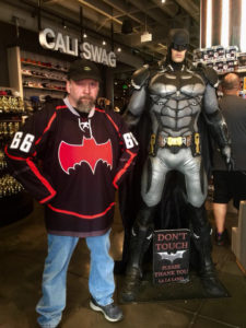 Our hotel was located just up the street from Hollywood Boulevard, so it was a quick two block or so walk down for us on Friday afternoon to do a bit of sightseeing. We walked by Grauman’s Chinese Theatre (now TCL Chinese Theatre) on one side of the street, and saw the El Capitan Theatre on the other side. It was hard to see some of the stars on the sidewalks because of all of the vendors set up along it. We did see a few and some hand/foot prints in the cement, as well as a few of the costumed characters and celebrity look-a-likes posing for photos with tourists. We crossed Hollywood and made our way over to the museum. They had a lot to see in the lobby including a Christopher Reeve Superman costume on display and we talked a bit with the staff, but I was a man on a mission and was there to see Batman!