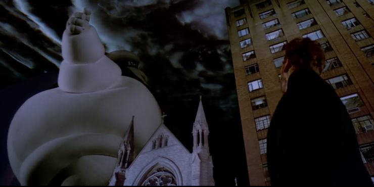 In the movie the Stay Puft Marshmallow Man walks up Central Park West and steps on the church before scaling the apartment building next door and really ticking off Peter Venkman.