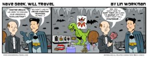 Collecting Guano Jul14 by Lin on July 14, 2018 at 1:00 pm Chapter: ComicsCharacters: Alfred, Batcave, Batman, Batmobile └ Tags: Batcave, Batman, Batmobile, Baturday, Bruce Wayne, geek travel blog, guano, Harley Quinn, Have Geek Will Travel, HGWT, Joker, Joker fish, Lin Workman, Mr. Freeze, T-Rex, Two-Face, web comic Related Comics ¬ Number of the Ginny Twinkies The Adventures of Superkid- pt1 2016- the year of “Kick Me” “I Can’t Warp-Drive 5.5!”